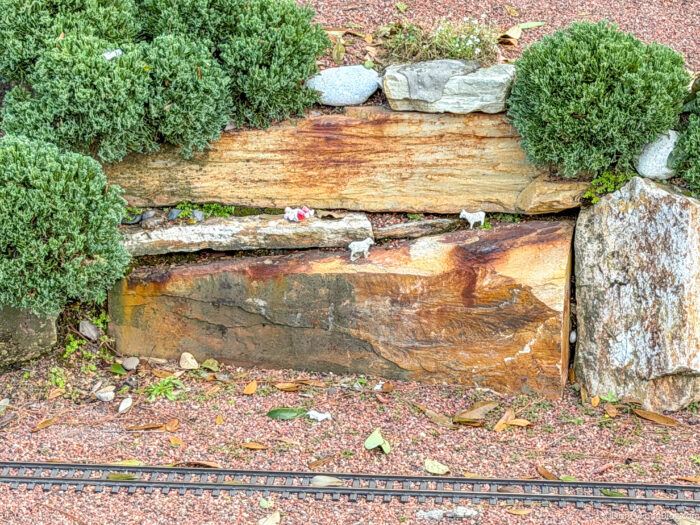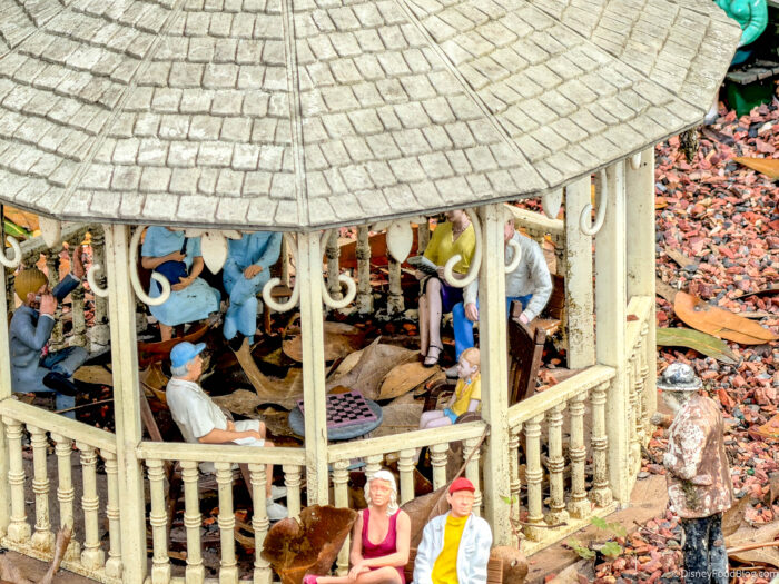 * The anarchy within is mostly created by natural occurrences, like giant squirrels, wind, rain, and relatively godzilla-sized lizards who frequent the town; but we find it fun and entertaining to make up fictional stories about what COULD be happening. We are grateful to the folks who create and maintain this Tiny Train Town for Disney World, as it’s one of our favorite parts of EPCOT and always has been.