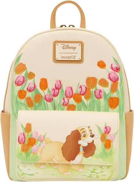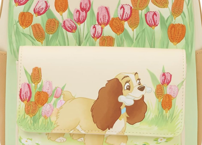This mini backpack features Lady from Disney’s Lady and the Tramp. She appears on the front pocket with a bone in her mouth. She walks through a field of tulips. On the back, you’ll find her doghouse, which says “Lady” on it. Embroidered details make the imagery on this bag pop!