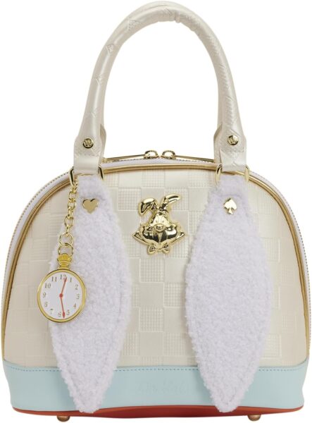This handbag is inspired by the White Rabbit from Disney’s Alice in Wonderland. You’ll find a white-and-grey checkerboard pattern all over the bag. A stripe of blue along the base says, “I’m Late.” You’ll find a 3D molded metal charm of the rabbit on one side, and you’ll find a blue appliqué of him on the back with debossed details. Two sherpa appliques extend down from the top handle that look like rabbit ears! You’ll also find a charm of a clock attached!