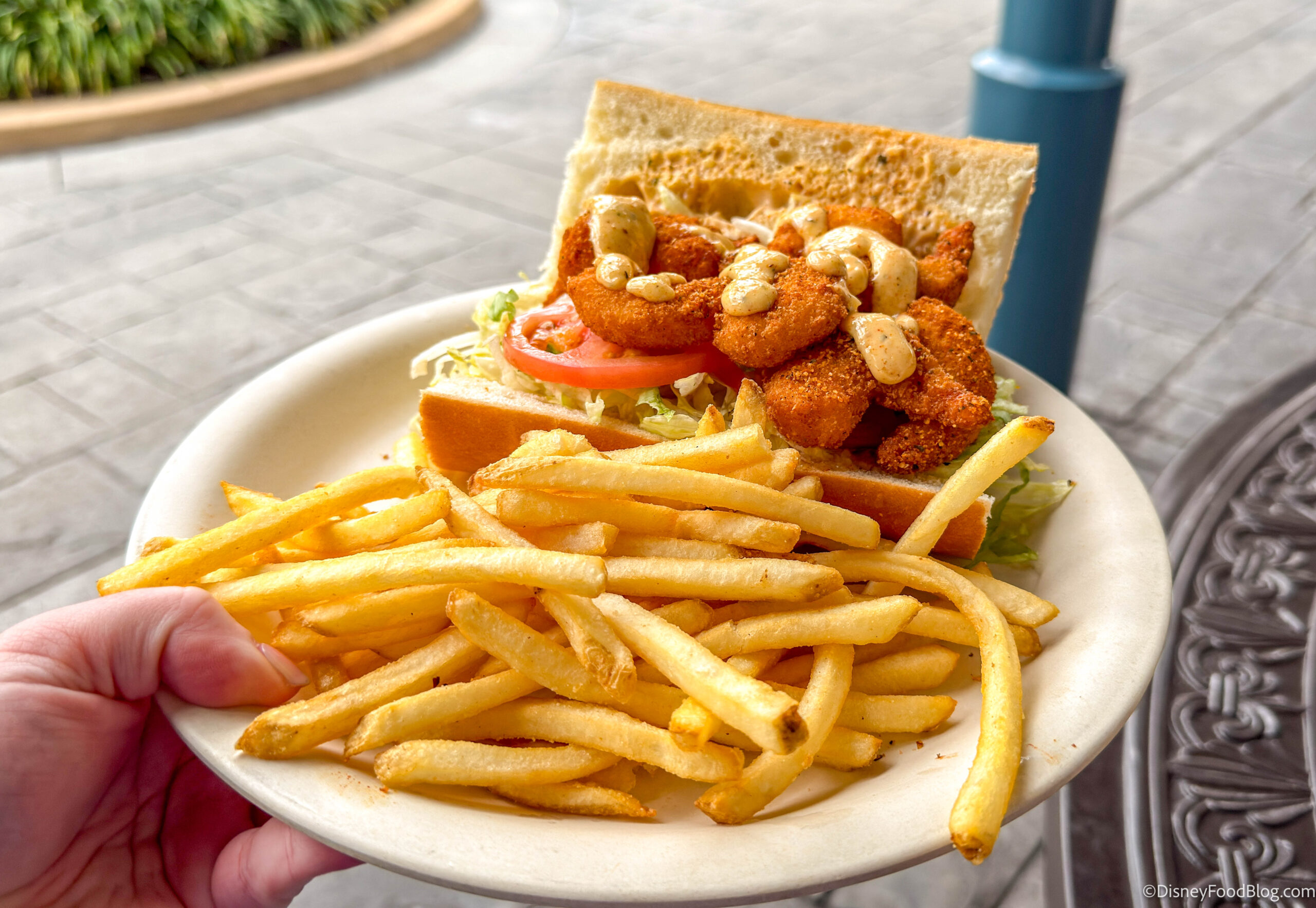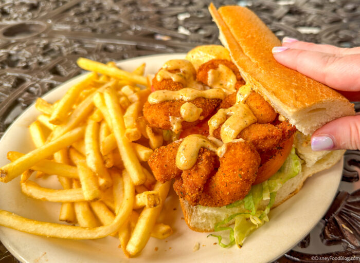 This was made fresh after we ordered it, so it took a minute, but honestly, it was worth it for the quality! The shrimp are salty with some Cajun seasoning (got a lot of that going on at this restaurant), and the breading was crispy and hot. Lettuce and tomato add some fresh flavors to the sandwich, and the remoulade gave everything a spicy kick while still being creamy. The bread was nice and soft, and this was a very filling portion with the classic Disney fries on the side.