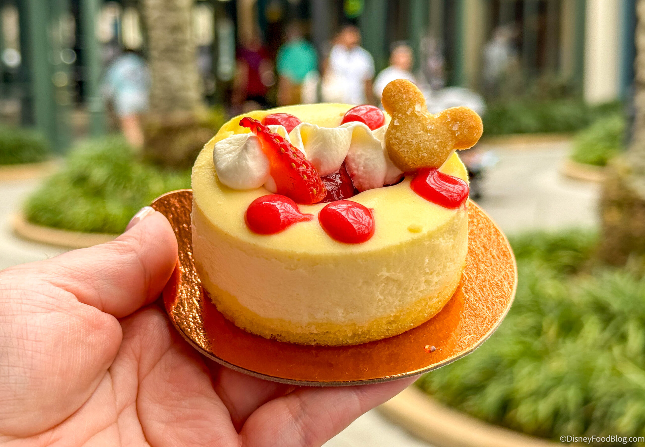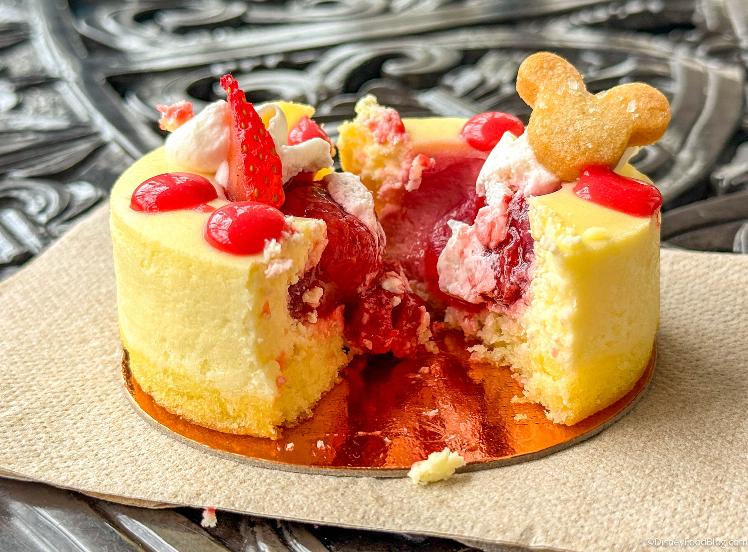 Finally, we wrapped up our meal with dessert, which was the seasonal cheesecake flavor! Right now, they’ve got Strawberry Cheesecake for $6.29. This has a strawberry filling in the middle and a cute little Mickey Mouse sugar cookie on top.