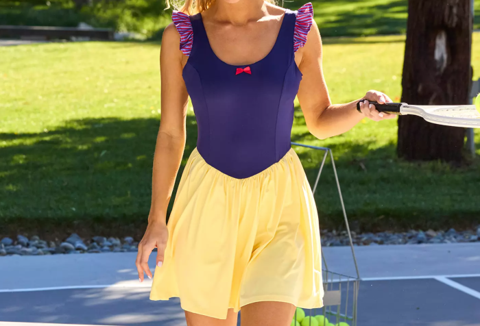 The Snow White Athletic Dress for Women by Her Universe features a blue top and yellow skirt reminiscent of Snow White’s iconic dress. The neckline has a small bow, which really takes it to the next level and makes it look like Snow White.