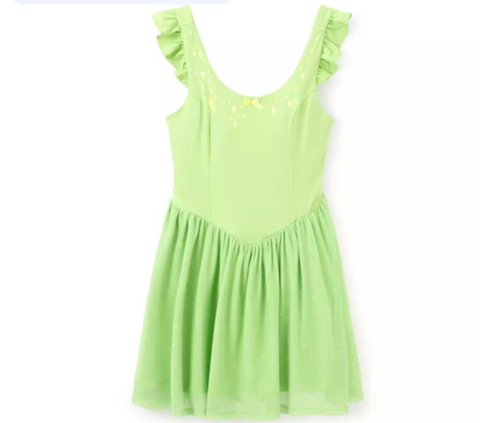 The Tinker Bell Athletic Dress for Women by Her Universe has a gathered skirt with printed pixie dust on a mesh overlay. The neckline features a shimmering Tinker Bell and pixie dust print with a satin bow appliqué. The ruffled wing sleeves add the cutest whimsical detail!