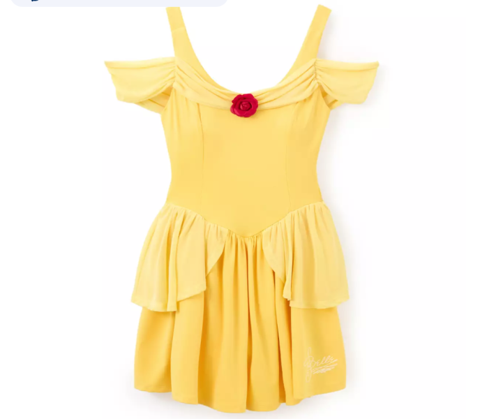 Another pretty one from the collection is the Belle Athletic Dress for Women. This is made to look like Belle’s signature ballgown with the yellow color, the ruffles on the hips, and the rose detail at the top. It even has off-the-shoulder draping.