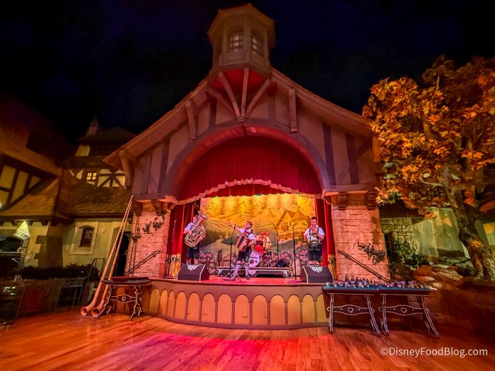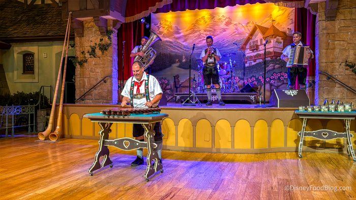 If you prefer quiet restaurants, then this one may increase your anxiety for other reasons. There is a live German band that plays traditional music while you’re eating! They play upbeat music that you may not be able to resist dancing to. You’ll see lots of guests dancing on the dance floor, and sometimes, the Cast Members will even join in! It’s lots of fun, but it might not be for everyone, especially those who deal with social anxiety. I will say, my kiddo, who doesn’t tend to do loud noises, LOVED eating and dancing here! The atmosphere really is a lot of fun.