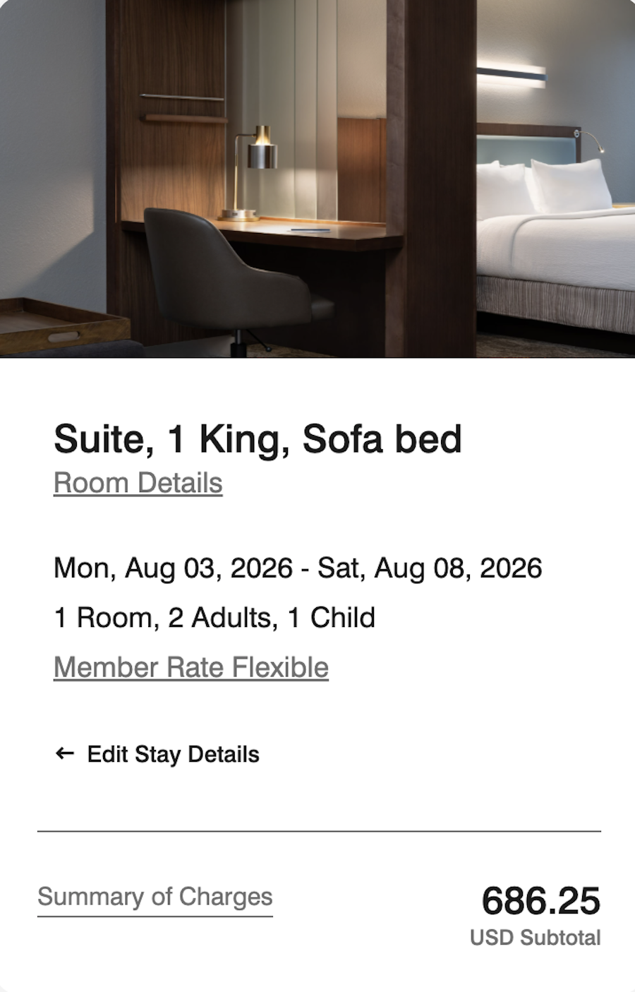 For a 5-night stay from August 3rd to the 8th, 2026, a hypothetical family of two adults and a 10-year old child will spend $686.25 for a Suite: 1 King, 1 Sofa Bed room at the Flamingo Crossings Springhill Suites.