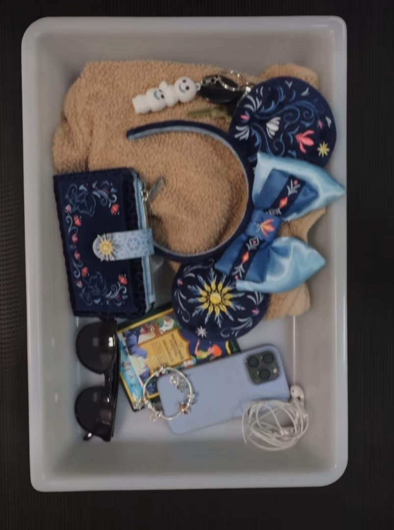 In the third bin, there are some normal essentials along with what we believe may actually be available in the park. We know that, for sure, we’ll be able to purchase the mini knitted-style Olaf plush, as well as the ear headband with the three Snowgies on top. However, it remains to be seen if we’ll be able to purchase the white belt bag in the bin, or if that was just for show!