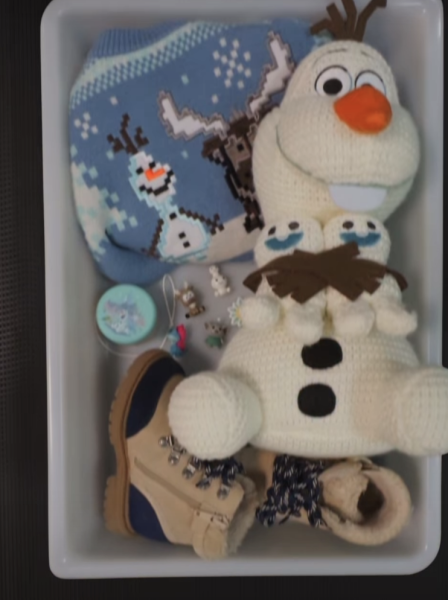 There’s so much to unpack here, we’ve got to break it all down. In bin one, we can clearly see an ADORABLE plush of Olaf holding some of the Snowgies, and it looks to be a knitted pattern! We can also see a collection of what looks to be mini ornaments or toys, all featuring characters from the films. There also seems to be a sweater that has Olaf and Sven on it, with the homemade style — how fun!