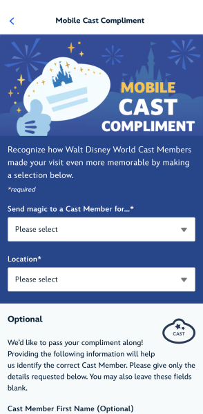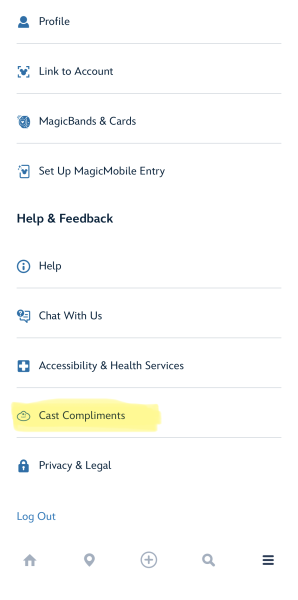Inside the My Disney Experience app, you can submit a mobile Cast Compliment directly from your phone. It takes maybe two minutes, and you don’t have to hunt down Guest Relations or fill out a paper form. You just open the app, tap the rightmost bottom icon, scroll all the way down, and look for the Cast Compliment option. From there, you can share the reason for your compliment, the location, enter the Cast Member’s name, their hometown, and the date of the interaction. It’s simple. It’s fast. And it actually matters.