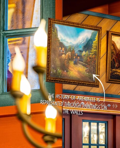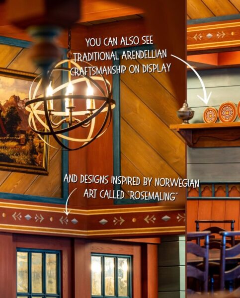 There are lots of Norwegian and Nordic details around the restaurant, as well. You can see Rosemaling, the design along the bottom, throughout the movies and other Arendellian craftsmanship.