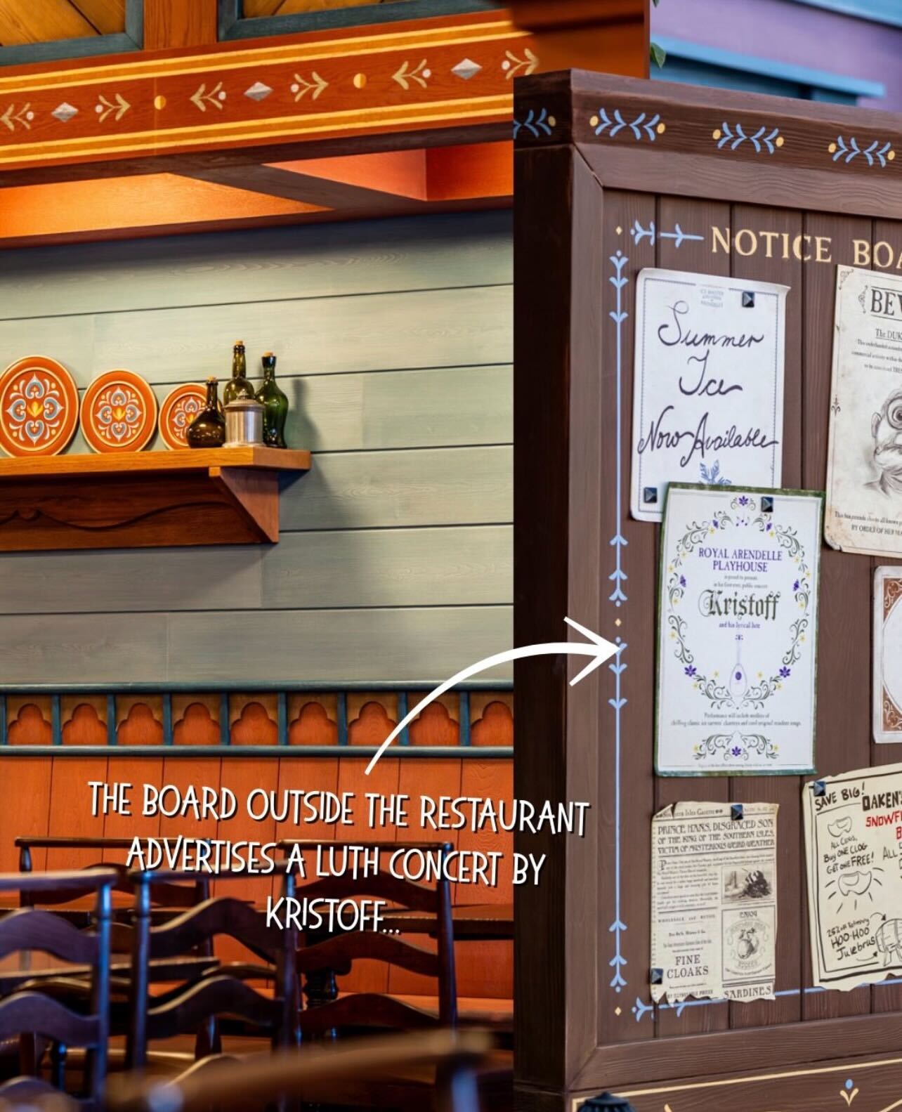 The notice board outside the restaurant has a poster for a concert put on by Kristoff. He’s playing the luth, the instrument he plays throughout the movies.