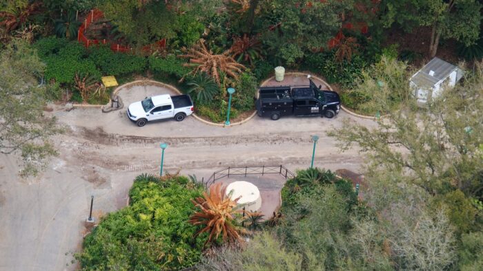 Thanks to @bioreconstruct on X/Twitter and Instagram, we’ve got a new look at the Tropical Americas construction at Animal Kingdom. At the former DINOSAUR ride, the exterior fountain and Iguanadon statue have been removed. There’s now a layer of dirt in its place. Disney seems to be in the process of gutting the ride since there’s a large pile of metal poles on the ground, in addition to what looks like fossil pieces from the queue in the pile on the top left corner.