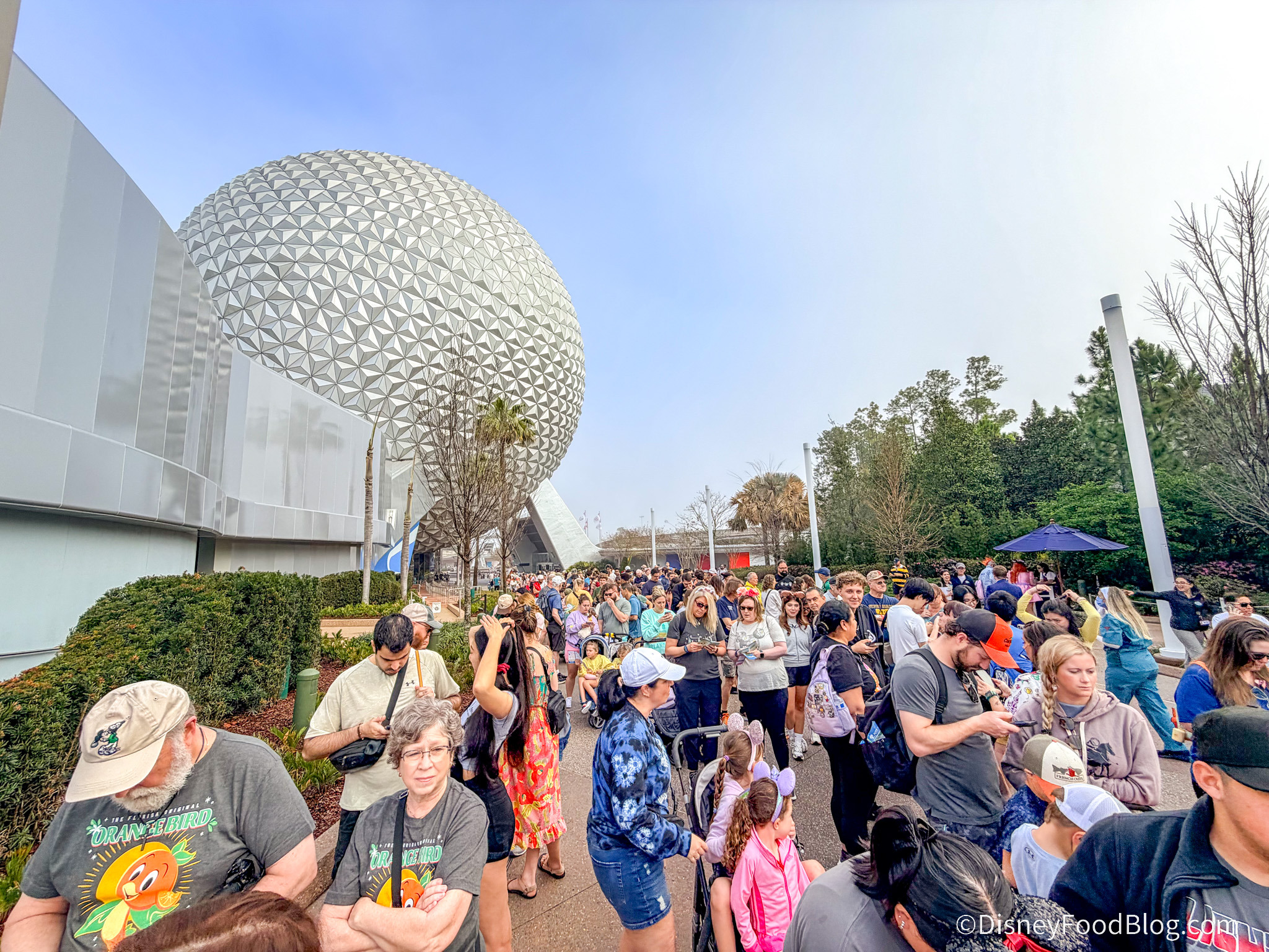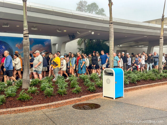 Usually, we’re just held in this section to the left of Spaceship Earth in one big blob. Now, Cast Members created three rows: one for people heading to grab the Flower and Garden souvenirs from Creations, one for the exclusive pins, and one for folks wanting to head to attractions.