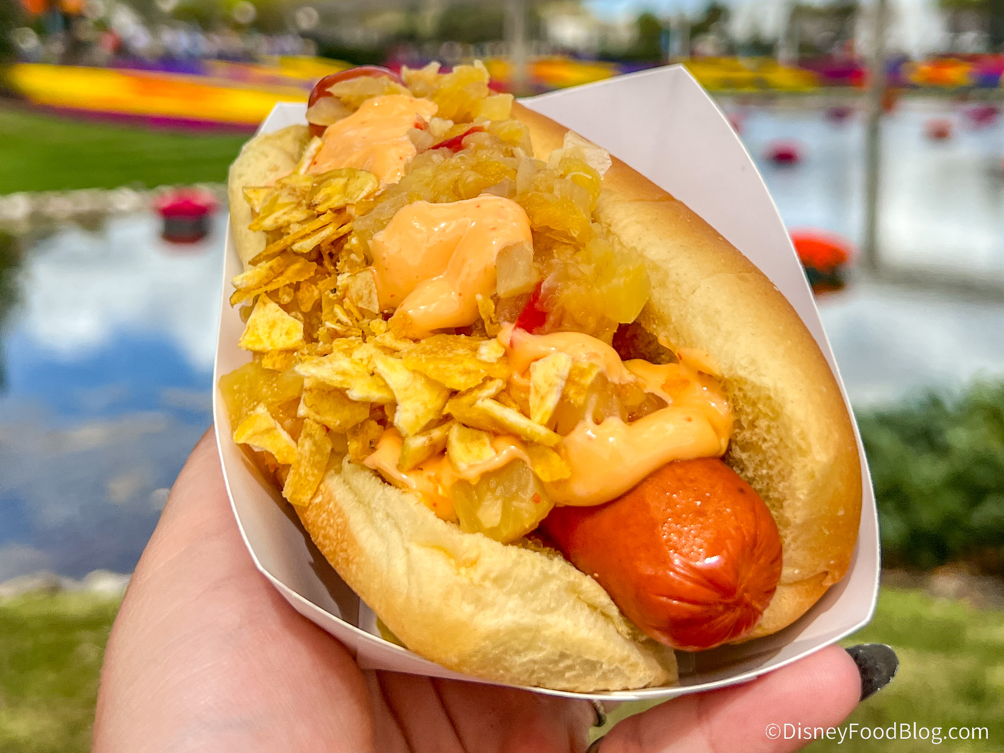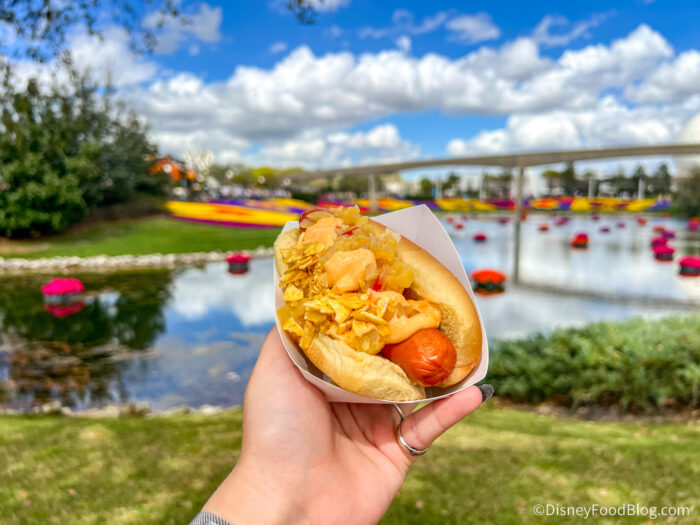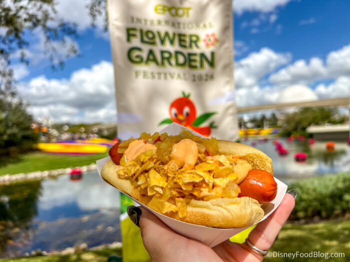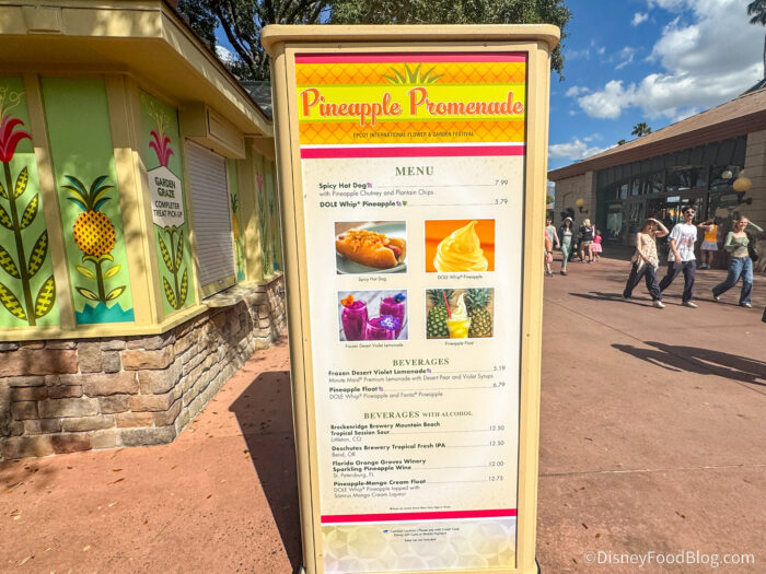 At the Pineapple Promenade booth, you’ll find returning eats and a couple of new drinks. This spot is known for serving DOLE Whip and the Flower & Garden staples of the Spicy Hot Dog and Violet Lemonade.