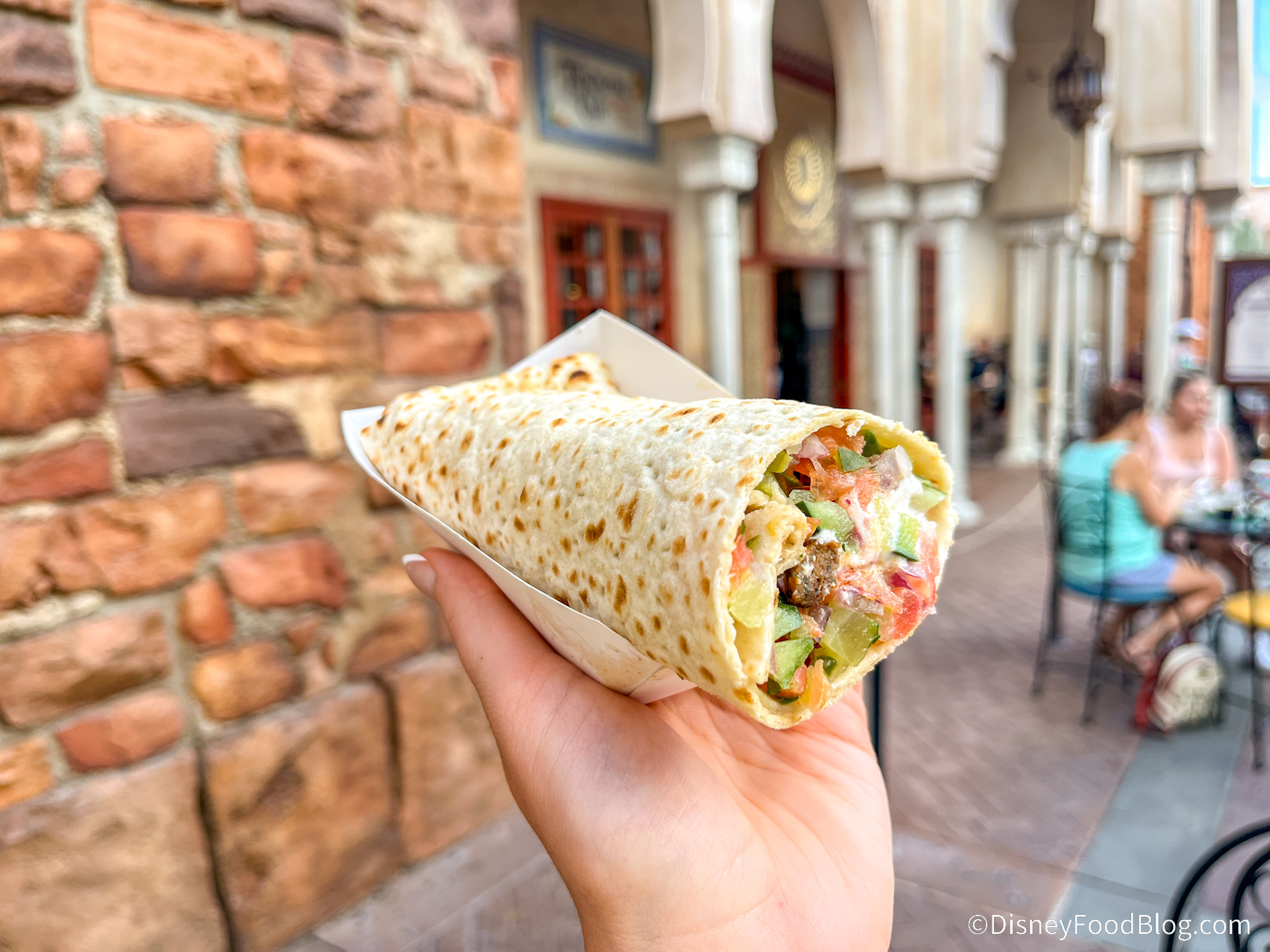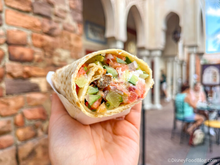 We’re starting off with the Moroccan Wrap for $6.29. This is made with tomato-cucumber relish and garlic sauce served on warm Moroccan flatbread, and you can order it with Chermoula Chicken, Moroccan-spiced Lamb, or Plant-based Falafel. We snagged the lamb version!