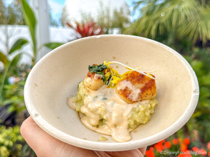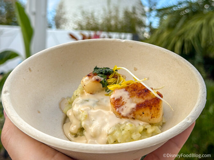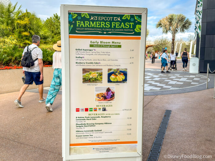 Over at EPCOT’s Farmers Feast, you’ll find a variety of available items. This is a special booth that has time-released menu items! Yep, depending on when you visit, you can experience a whole new set of bites and nibbles! Since we’re here for the first day of the festival, we’ll be able to try the options from the Early Bloom Menu!