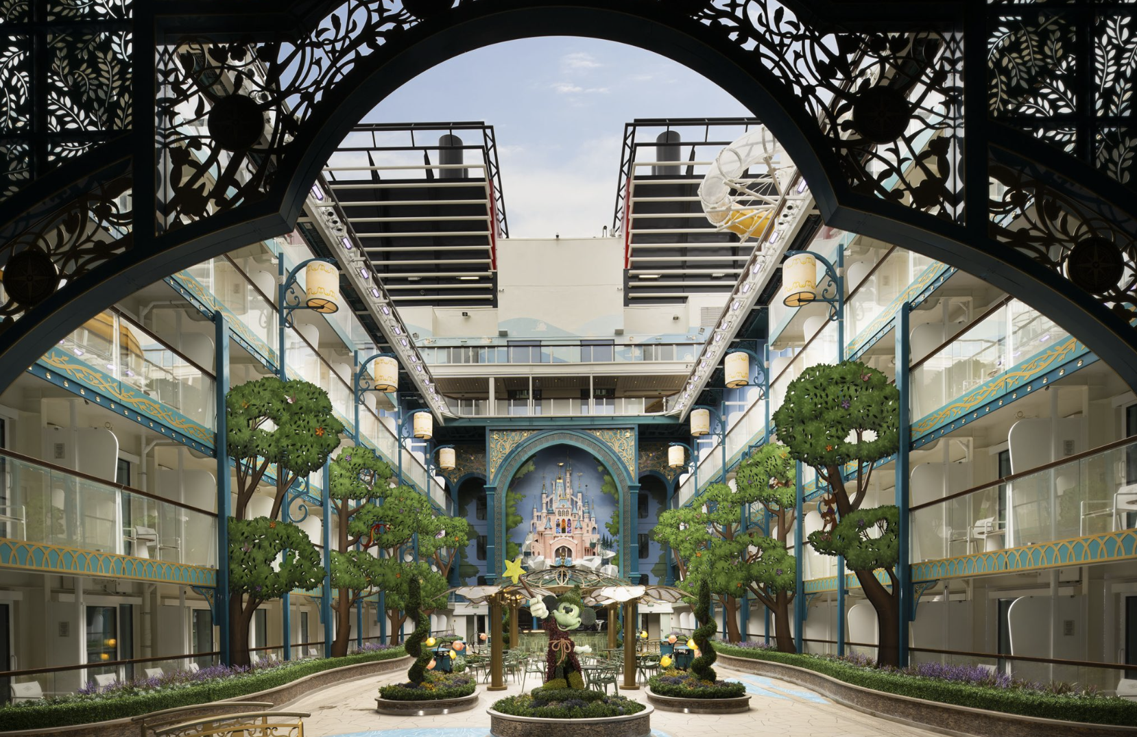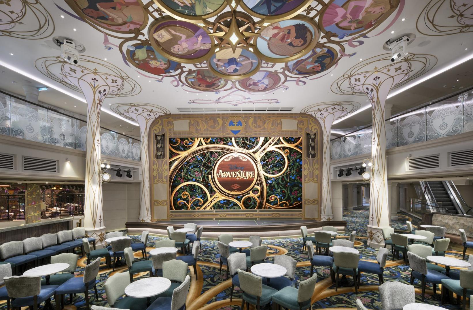 Town Square is made to celebrate Disney Princesses with artwork on the ceiling and hidden details throughout. Here, you’ll find Bibbidi Bobbidi Boutique, as well as the dining locations of Spellbound and Enchanted Summer Restaurant. Town Square is also home to a Disney Cruise Line staple — the Walt Disney Theatre. That’s where you’ll catch the Broadway-style shows each evening.