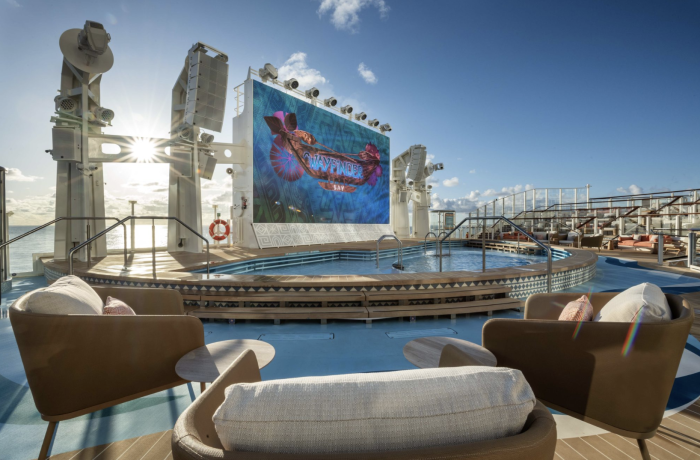 On the ship’s stern, there’s a serene area called Wayfinder Bay, themed to Moana. Disney says, “This relaxing outdoor oasis offers a serene palace to unwind by the pool, take in sweeping ocean views, and enjoy live entertainment.”