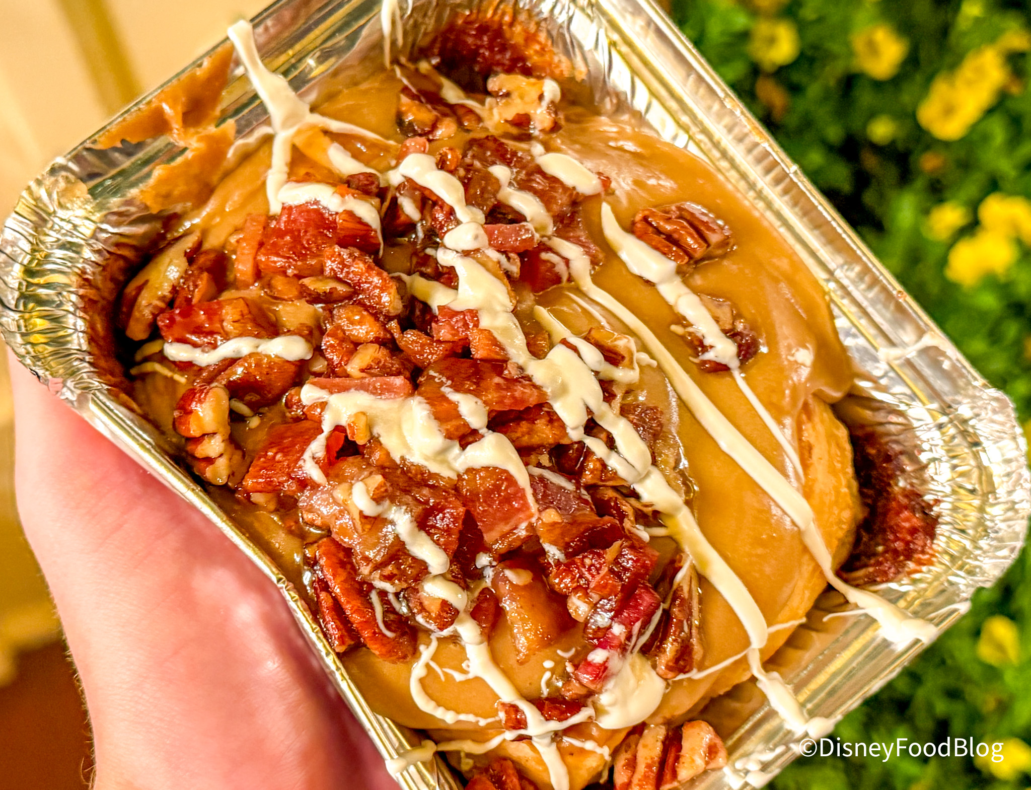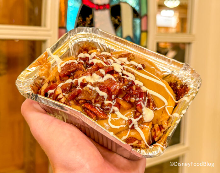 First up, we headed over to Jolly Holiday to try out the Maple Bacon Cinnamon Roll for $10.99! This is a cinnamon roll topped with maple cream cheese, glazed bacon and pecans, and drizzled with white chocolate.