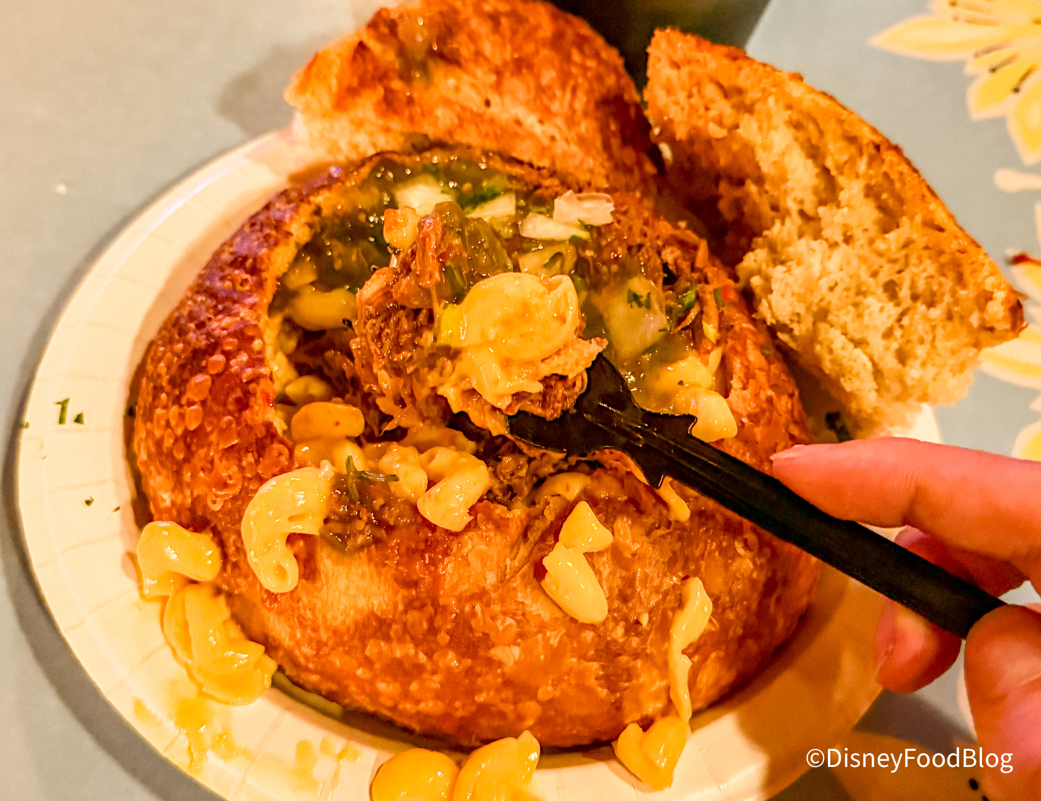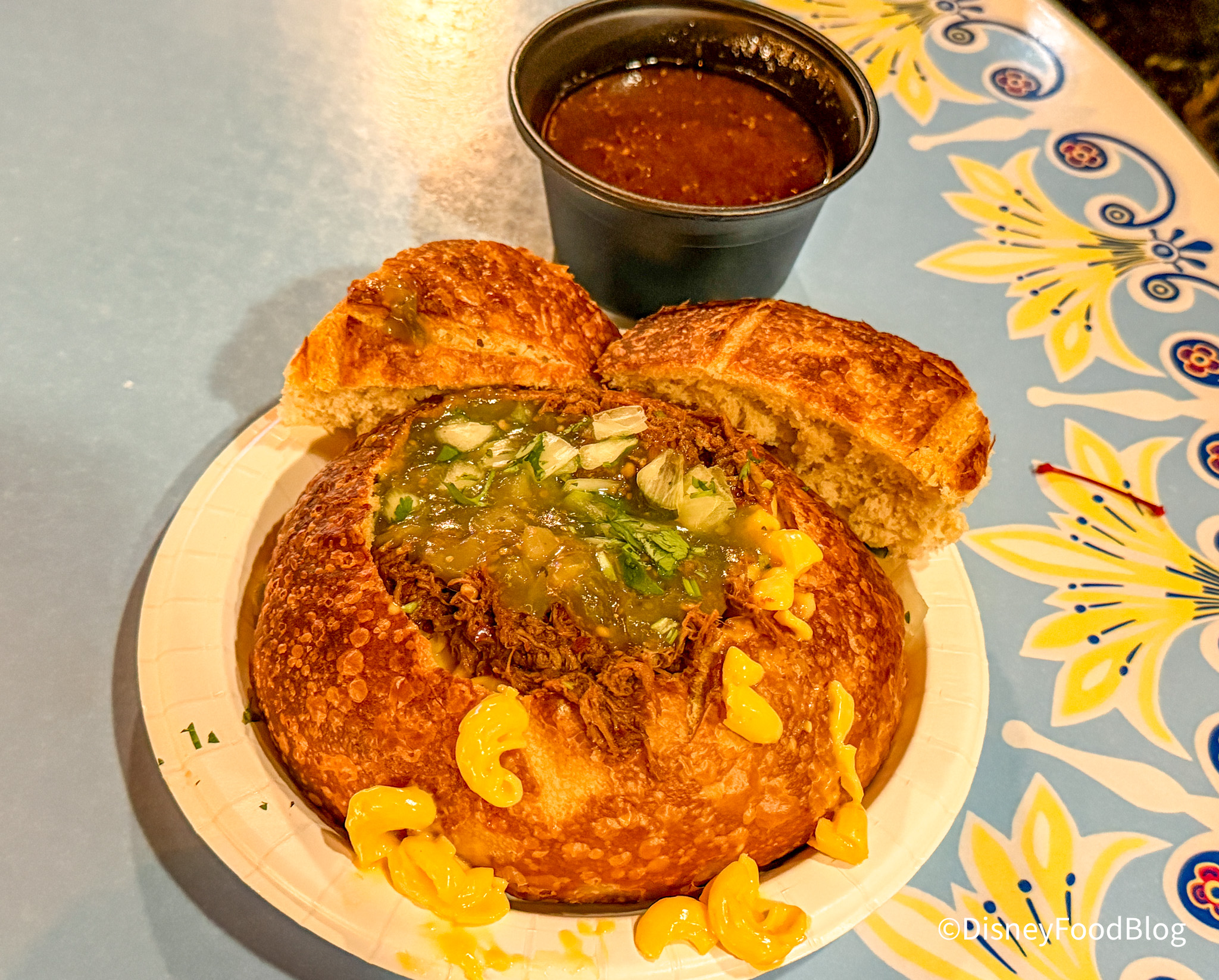 Over at Refreshment Corner, you can snag the Birria Mac and Cheese in a Bread Bowl for $12.99. This is mac and cheese topped with beef birria, salsa verde, cilantro, and onion in a sourdough bread boule, served with consomé.
