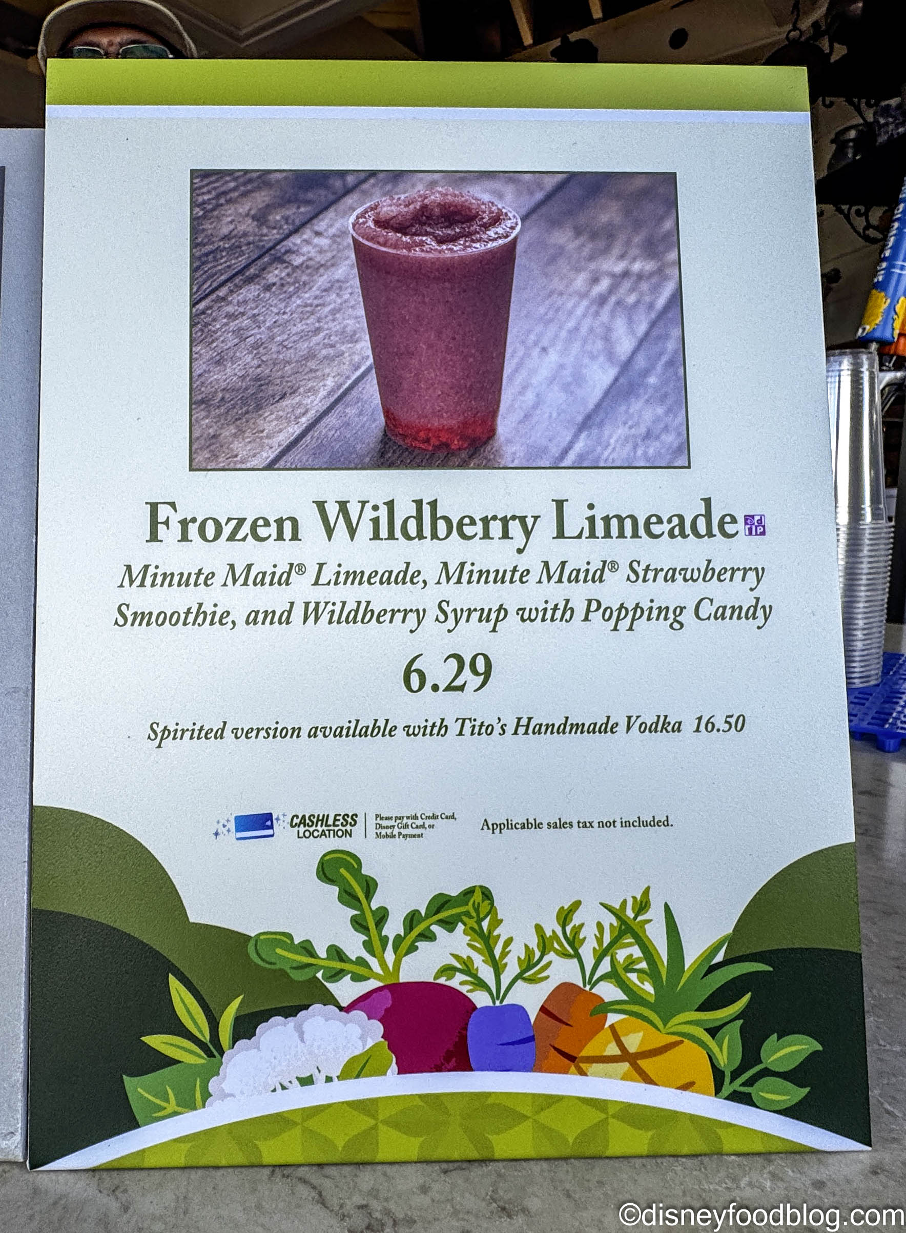 The non-boozy Frozen Wildberry Limeade: Minute Maid Limeade, Minute Maid Strawberry Smoothie, and wildberry syrup with popping candy is $6.29. You can make this drink boozy by adding Tito’s Handmade Vodka for $16.50.
