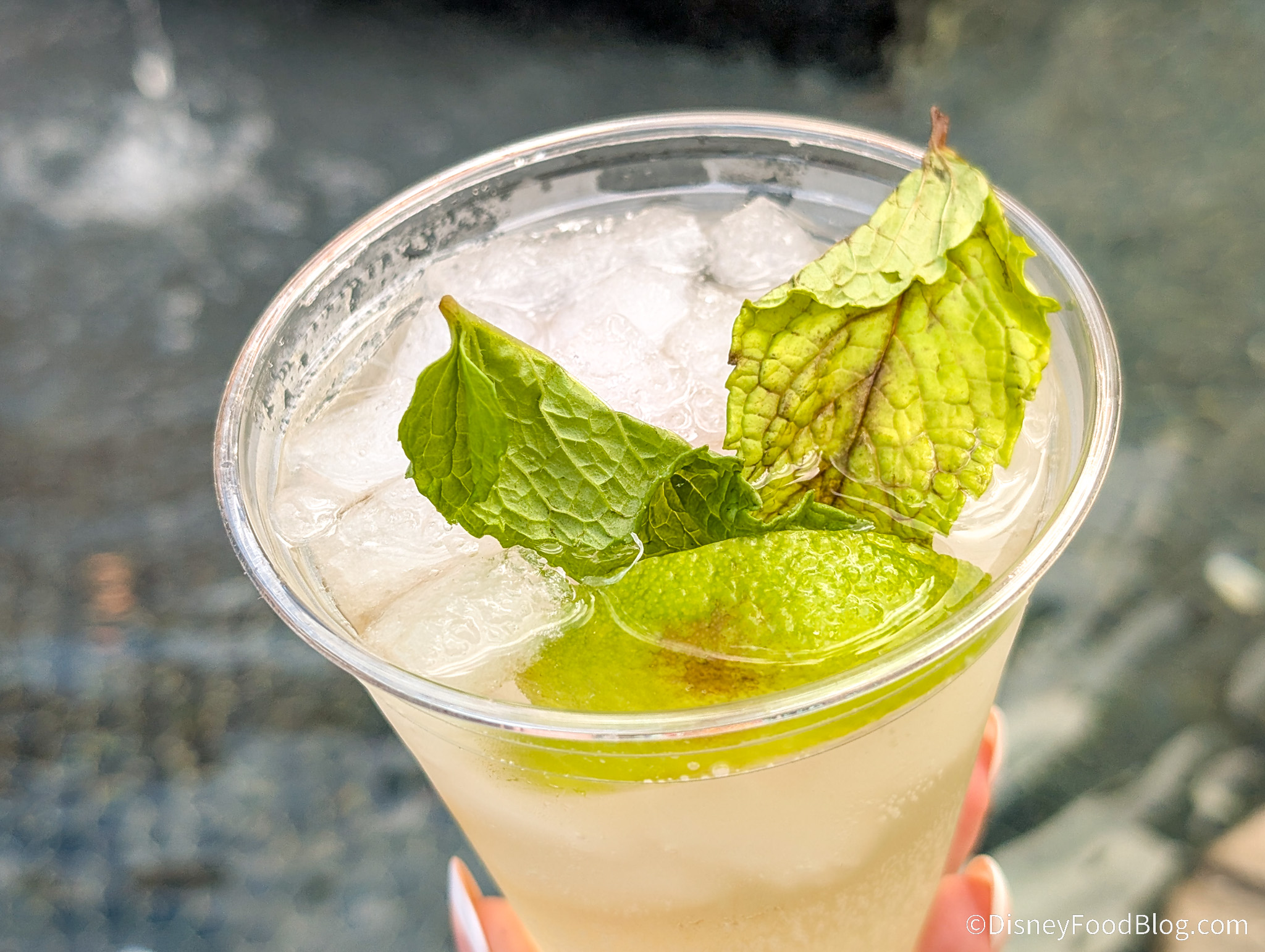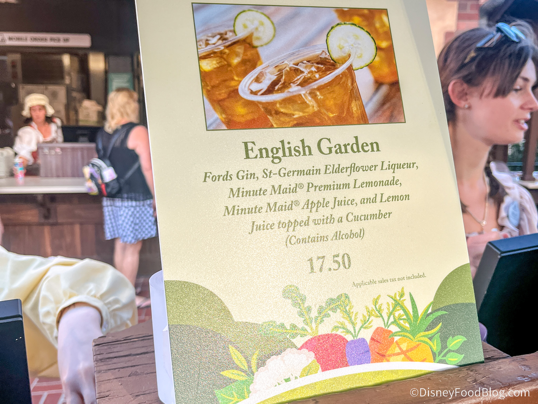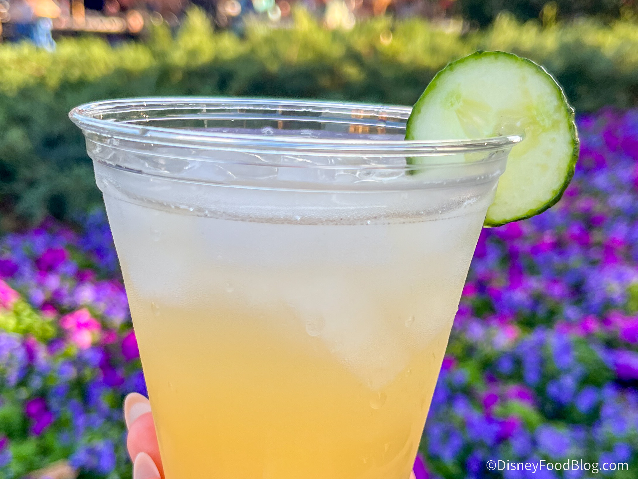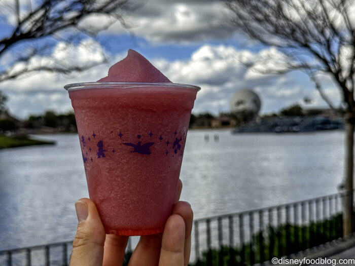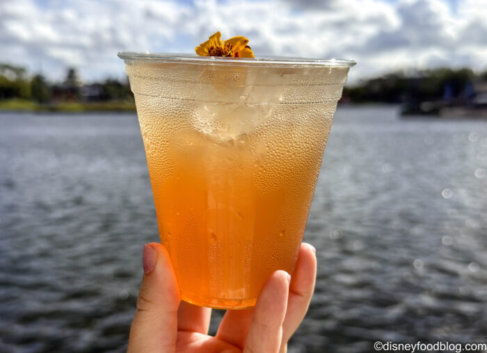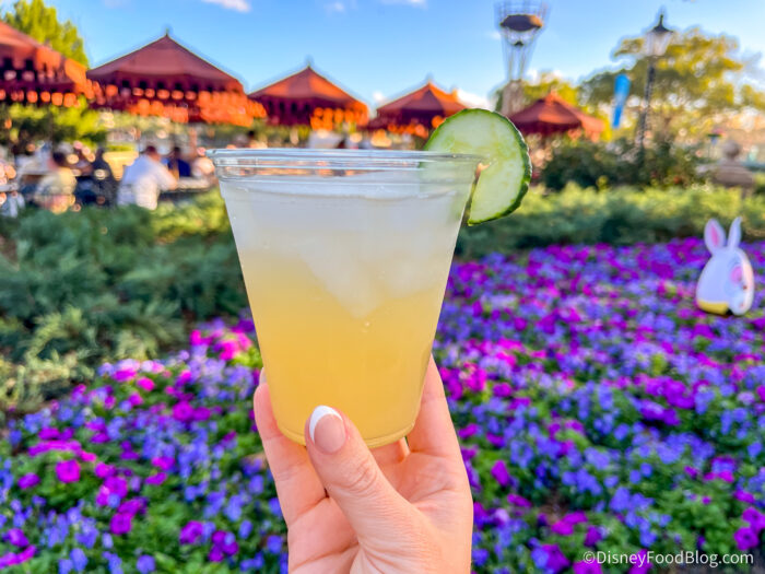 This was a very light and refreshing drink, mostly juice-forward without much noticeable alcohol flavor. We could really taste the lemonade and apple juice, and you get a lot of the cucumber scent with that because of the slice on the rim. This would be a great beverage for just walking around the World Showcase on a hot day.