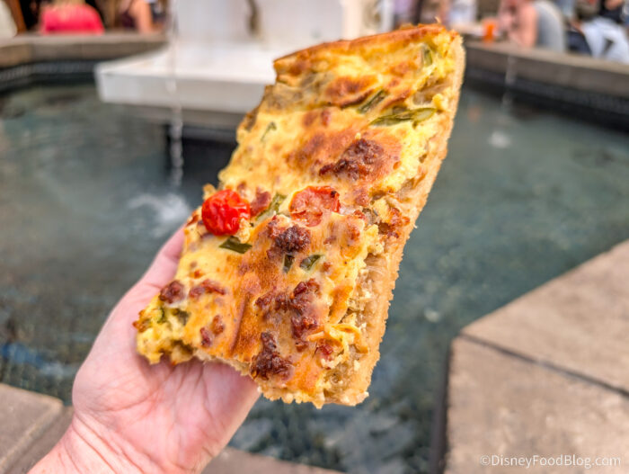 This was TRULY spectacular, you guys. It was cheesy and quiche-like, almost more like a breakfast dish to us. There’s a decent amount of egg, but it doesn’t ruin the texture or flavor by being too eggy. The veggies were baked perfectly into the custard layer, and the caramelized onions underneath added an amazing savory, rich flavor. This was one of our favorite items we ate all day!
