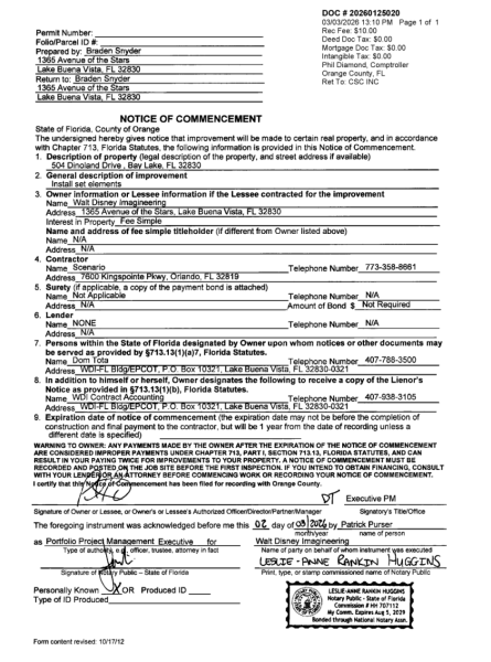 The contractor listed on the Notice of Commencement permit has worked with Walt Disney Imagineering before, helping with attractions such as Pirates of the Caribbean: Battle for the Sunken Treasure at Shanghai Disney. The contractor has also worked on Star Wars: Galaxy’s Edge at both parks. Their work for the lands included 3D Show Set Design, Building Information Modeling, show set theming for 15 ride scenes, and more.