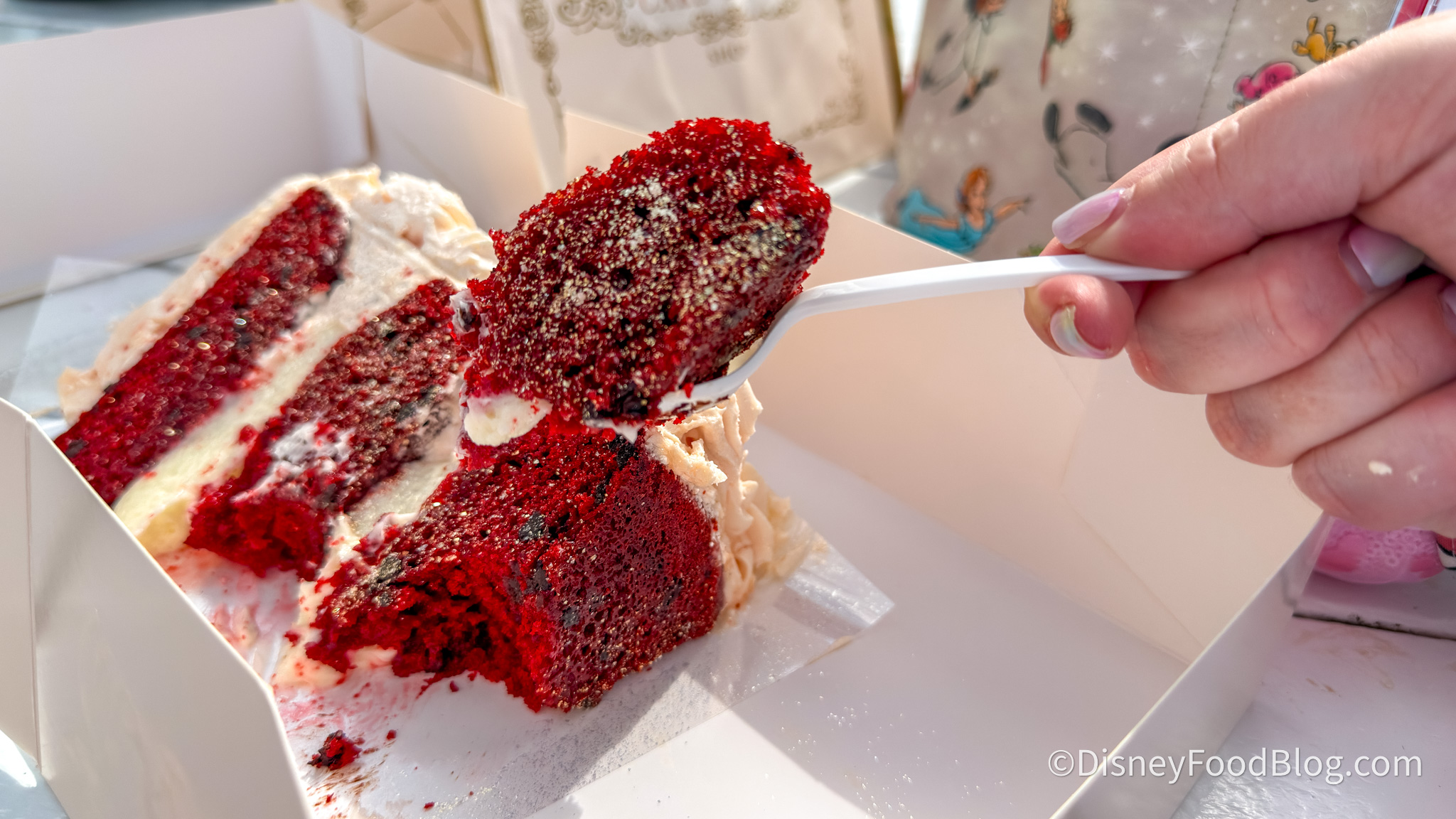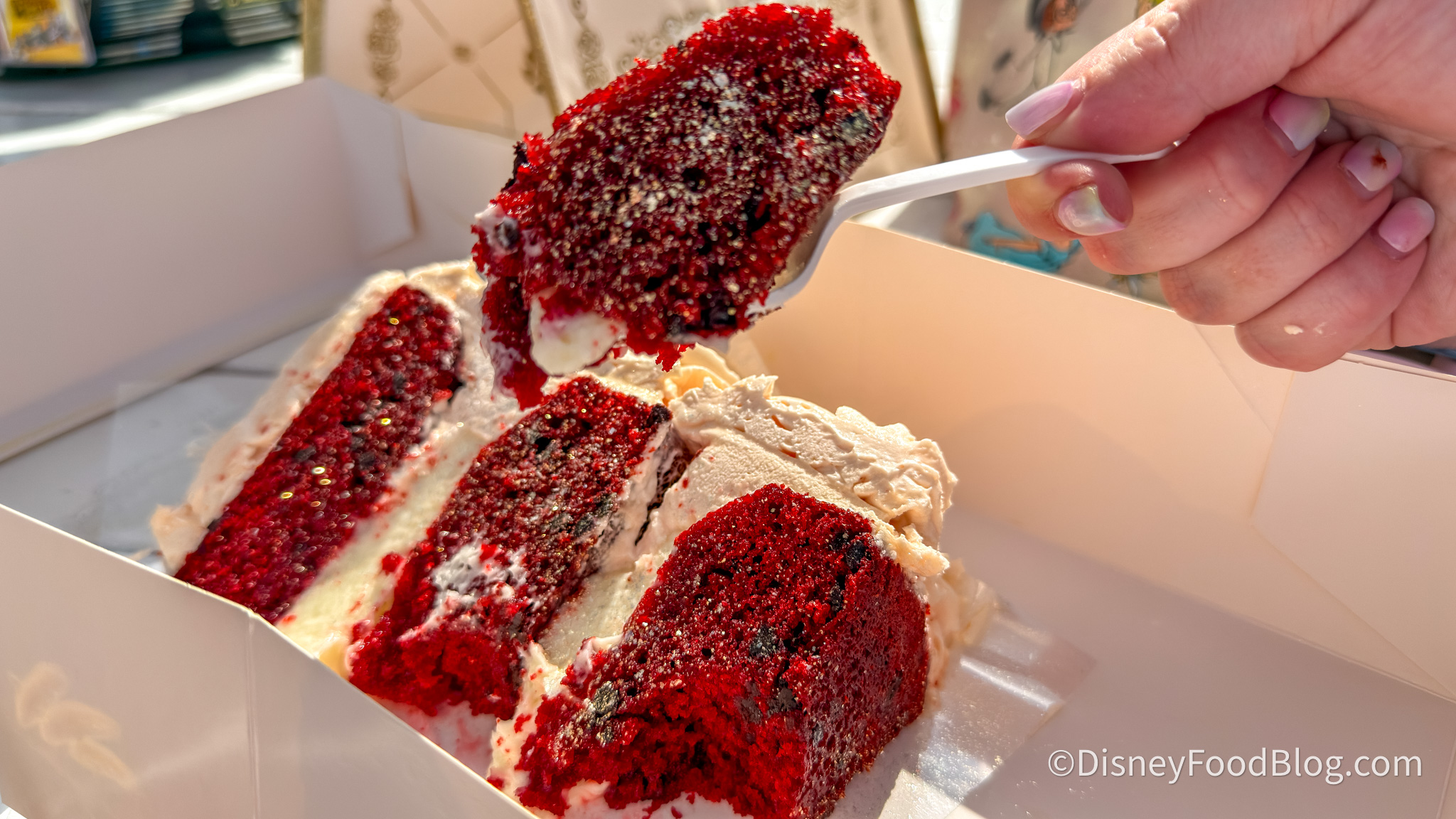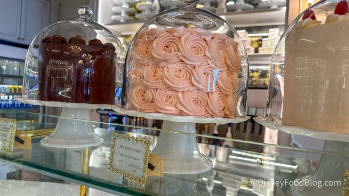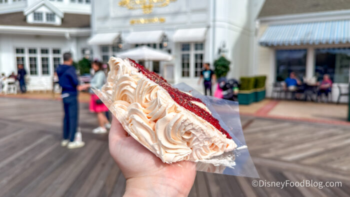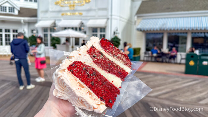 The exterior is coated in a pink buttercream that is honestly one of the prettiest things we have seen in a Disney World bakery, and the inside layers are filled with cream cheese frosting. The cake itself is deeply, richly red and incredibly moist, and there are what appear to be chocolate chunks worked in as well, adding this subtle depth that you wouldn’t necessarily expect but absolutely appreciate.