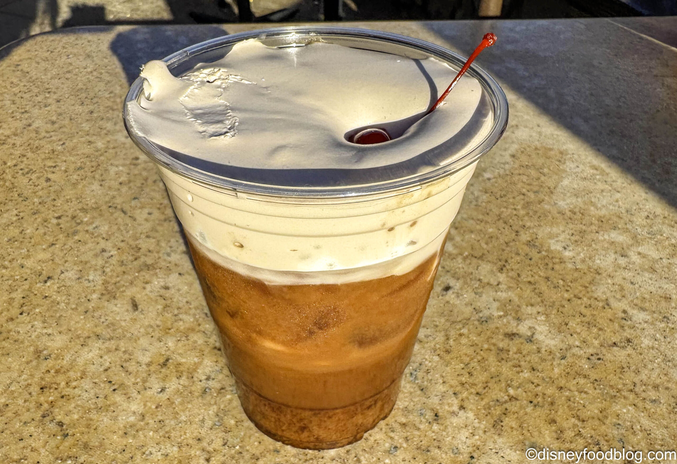 In terms of drinks at this menu, we got the family-friendly Cherry Cola Cold Brew for $7.50. This is made with Joffrey’s Coffee 70th Anniversary Blend, oat milk, and vanilla crème and cherry syrups, topped with a cherry cola cold foam and a maraschino cherry.