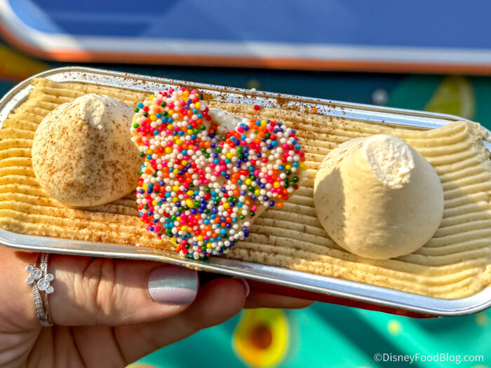 Now it’s time for a little dessert. We grabbed the returning Café de Olla Tres Leches Cake for $8.25. This treat is made with Café de Olla-infused tres leches topped with piloncillo, chantilly, cinnamon, and a Mickey-shaped cookie. We really enjoyed this cake last year, but thought they were a little heavy-handed with the chantilly cream. This year, we felt the balance was a little better.