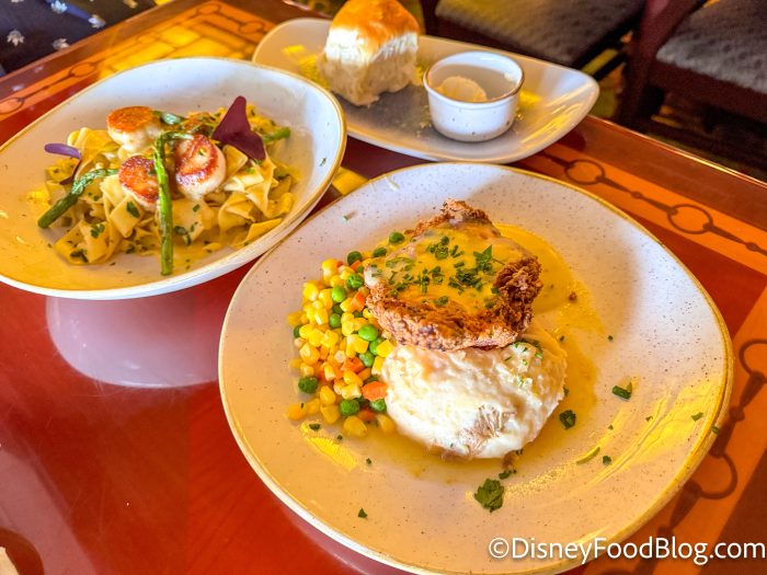 The Turf Club is tucked away at Saratoga Springs and offers a variety of standard American fare for dinner, including pasta dishes, salads, seafood appetizers, steaks, and chops for the evening dinner hours. The indoor seating area is refined with dark woods and forest greens, though it’s not at all stuffy. A covered outdoor seating area also boasts views of Lake Buena Vista.