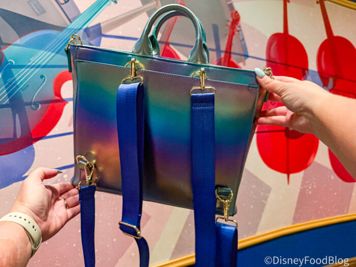 When it comes to using a backpack in Disney World, there are two major ways we see people go, and the first is using mini Loungefly backpacks around the park. Bags like the Fantasia Convertible Loungefly Backpack & Tote Crossbody Bag are very useful, because you can wear them in numerous ways, but the traditional Loungefly bags are mini backpacks. That means you’ve got two straps that go over your shoulders, some of them have water bottle pockets (which are a HUGE plus and very necessary), but there’s one big caveat — they leave a MASSIVE back sweat stain on your shirt during those warmer seasons.