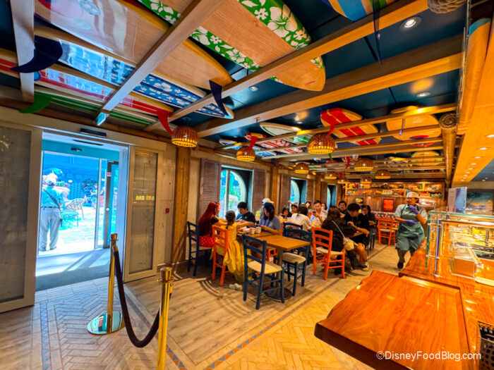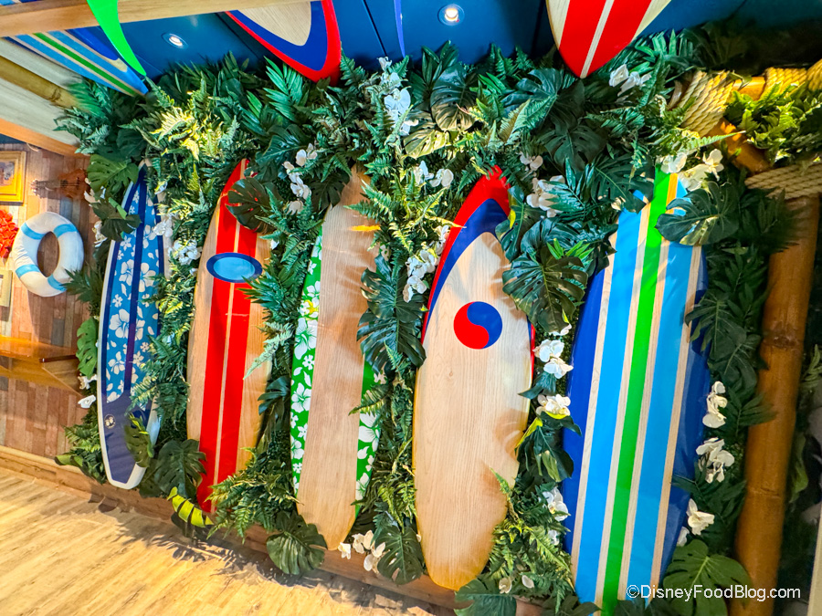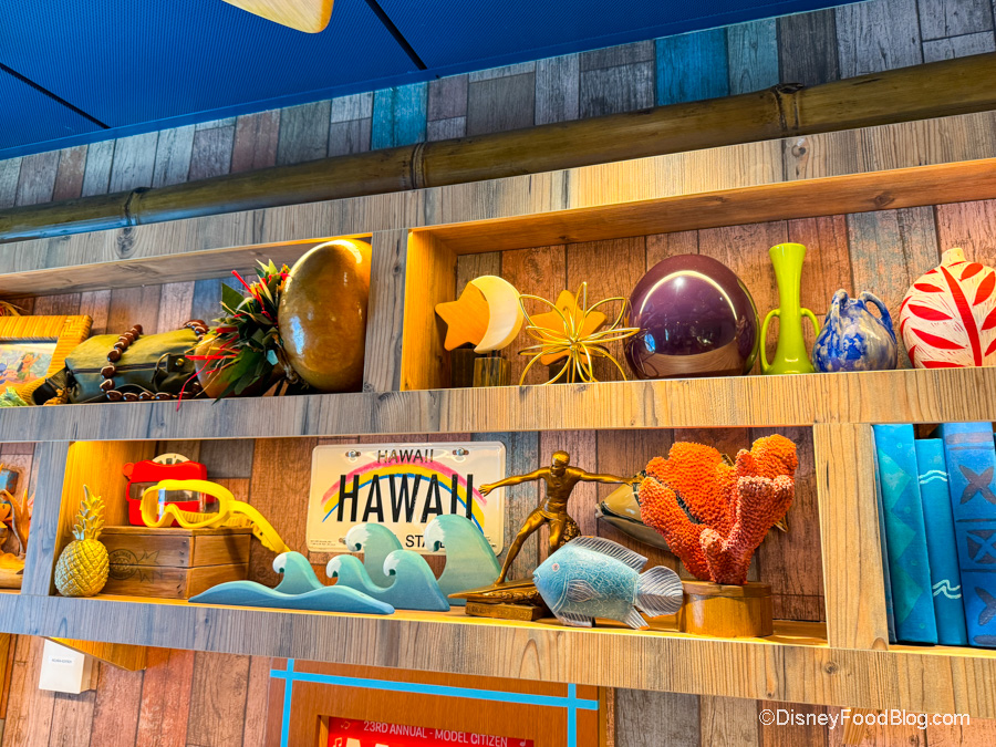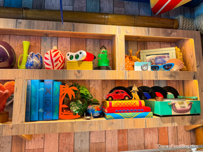 There are a ton of Hawaiian and beach accents, including shelves full of fun decor (many with Lilo & Stitch Easter eggs).