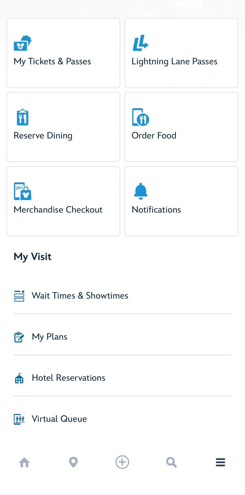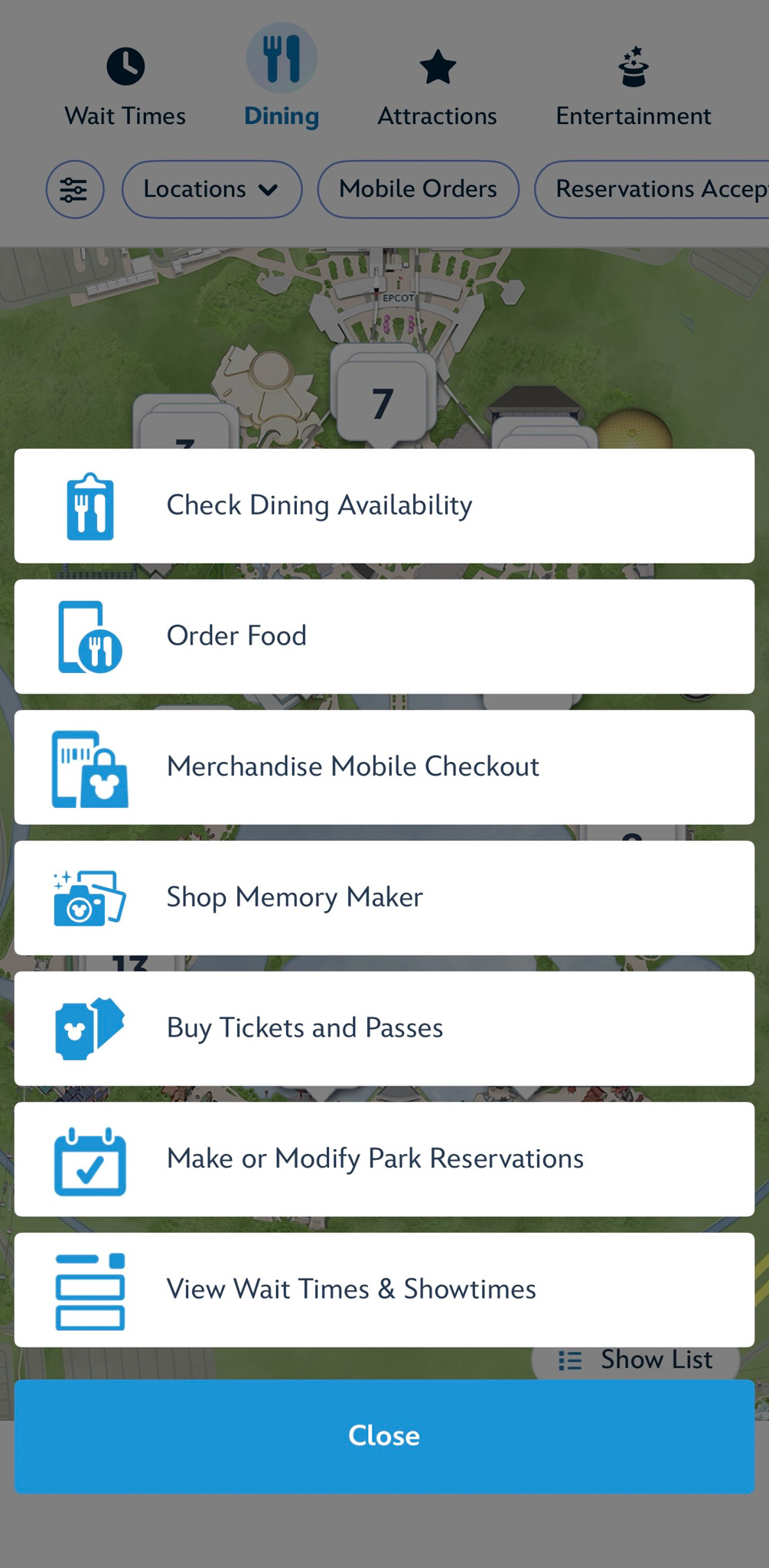 … and features including dining reservations, mobile order, tickets, Lightning Lanes, etc. are still available as well.