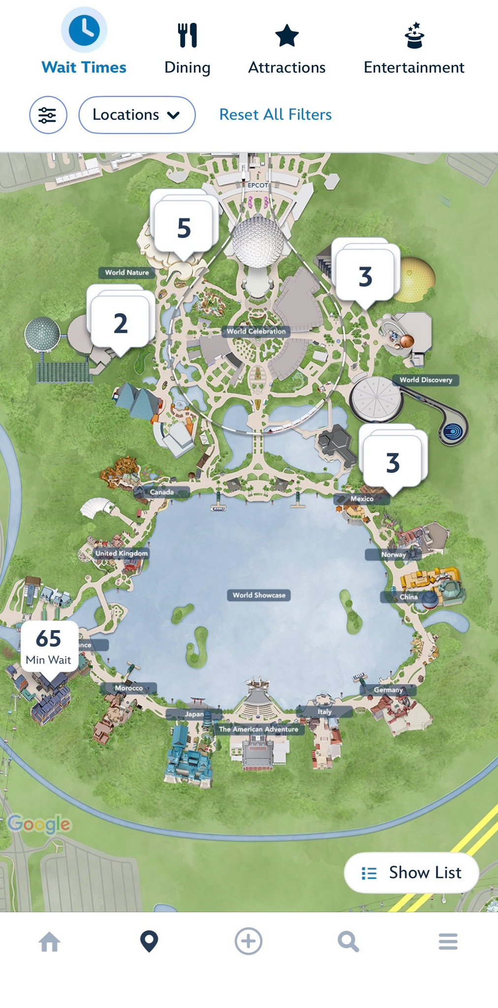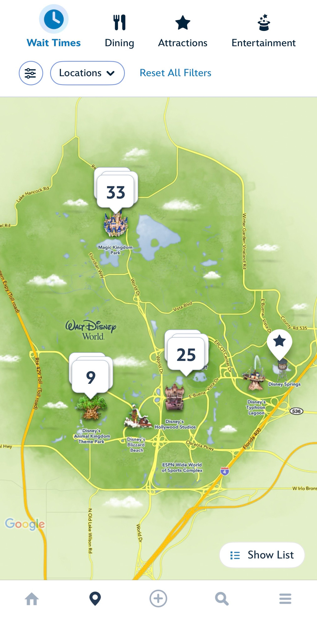… including the ability to zoom into each park to see all attraction and dining wait times.