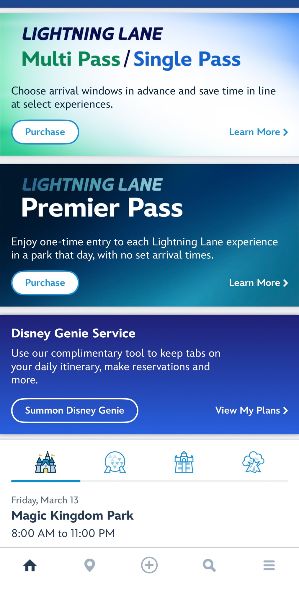 The app’s main welcome page still looks similar, with information on the Lightning Lane tiers…