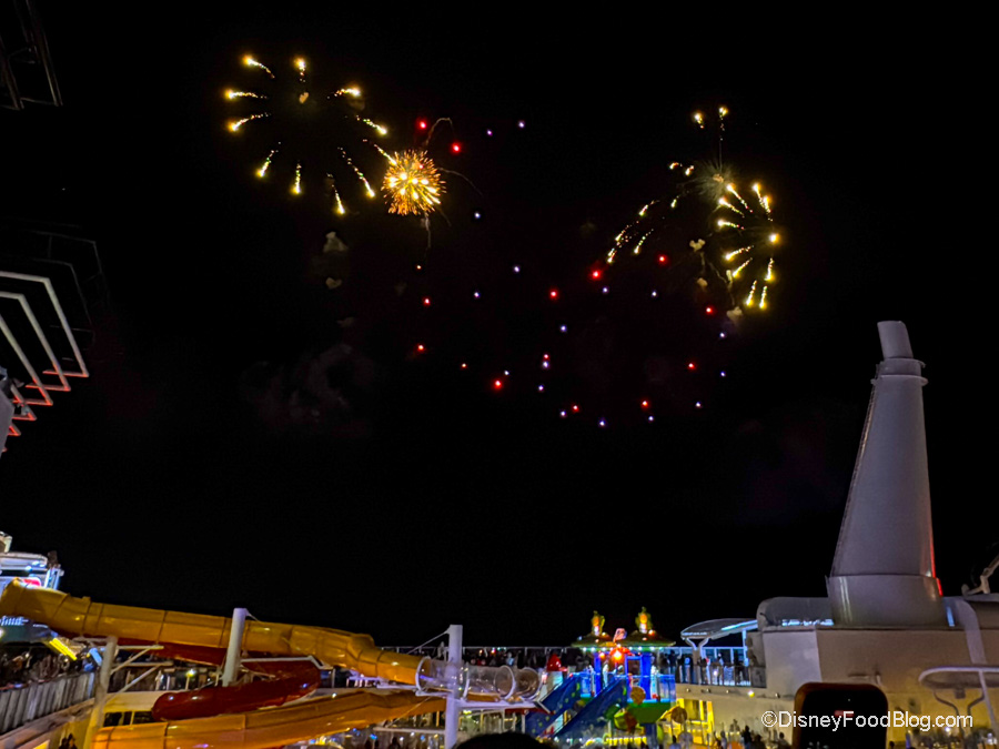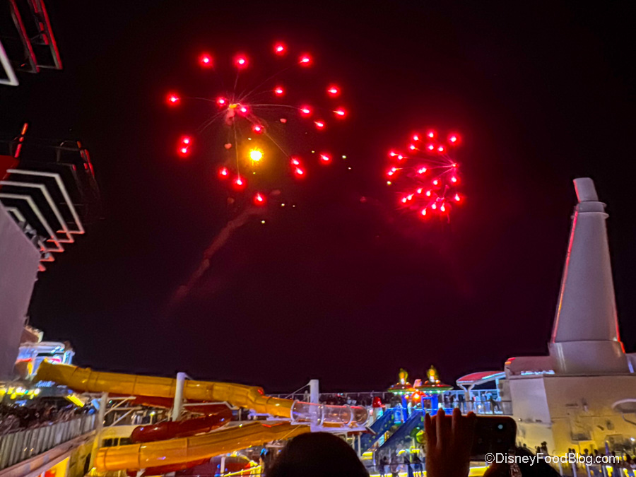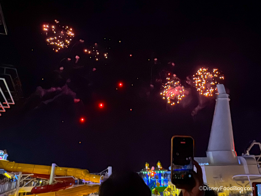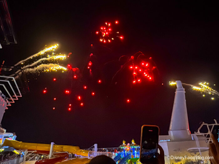 We have to say this is probably the BIGGEST fireworks show we’ve ever seen on a Disney Cruise. It fills the sky, and y’all, it’s pretty impressive.