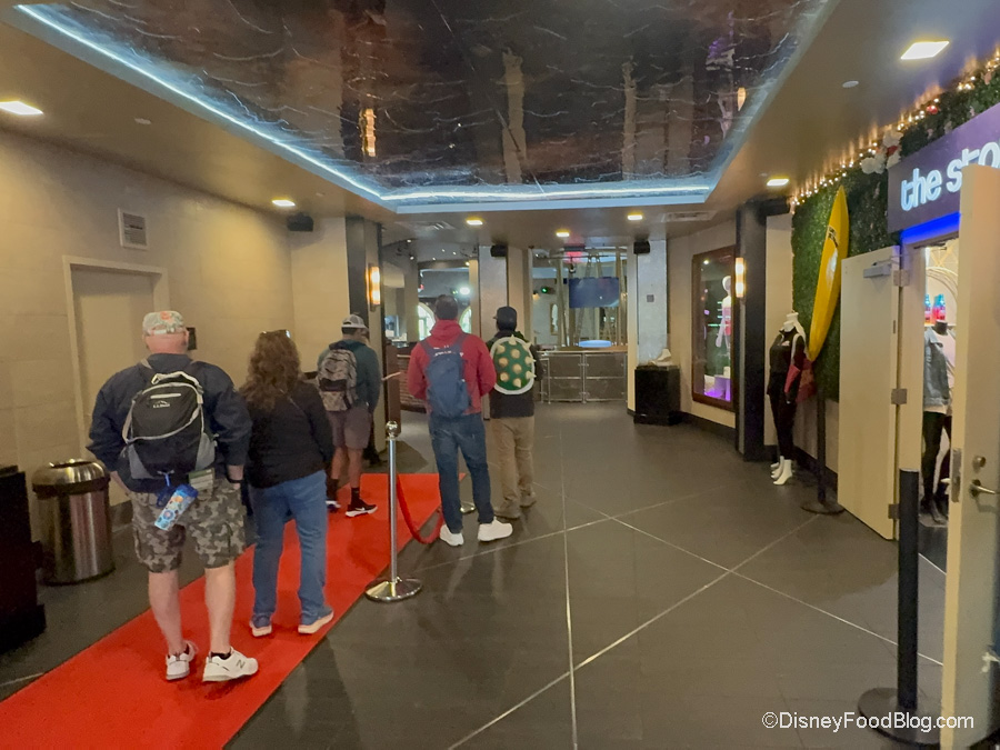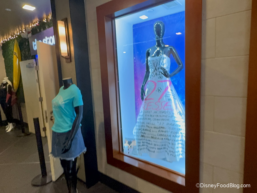 While you’re waiting, be sure to keep an eye out for some fun movie-related items. You’ll see display cases with costumes and props from iconic movies, like a dress from 27 Dresses.