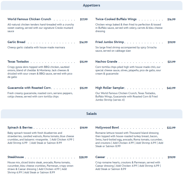 The food here is described as American casual, which means standard appetizers like Nachos, Garlic Bread, and the World Famous Chicken Crunch. A variety of salads is also available.