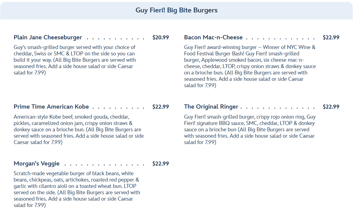 Entrees include Guy Fieri! Big Bite Burgers…