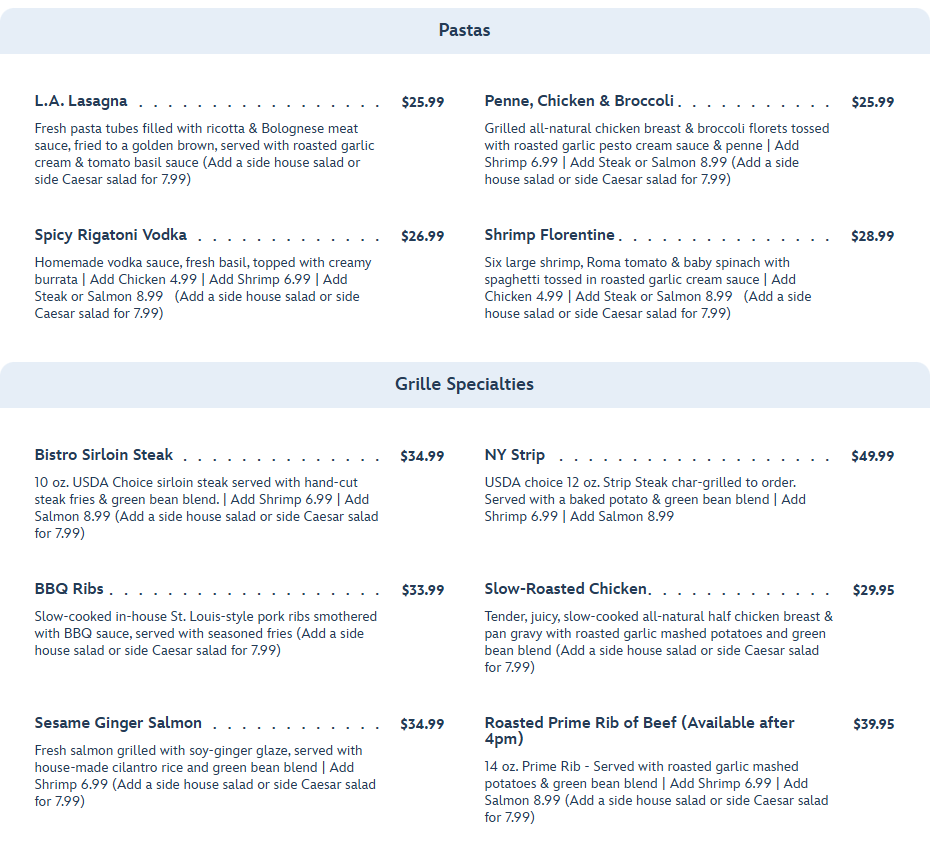 You can also get Pastas and Grill Specialties.