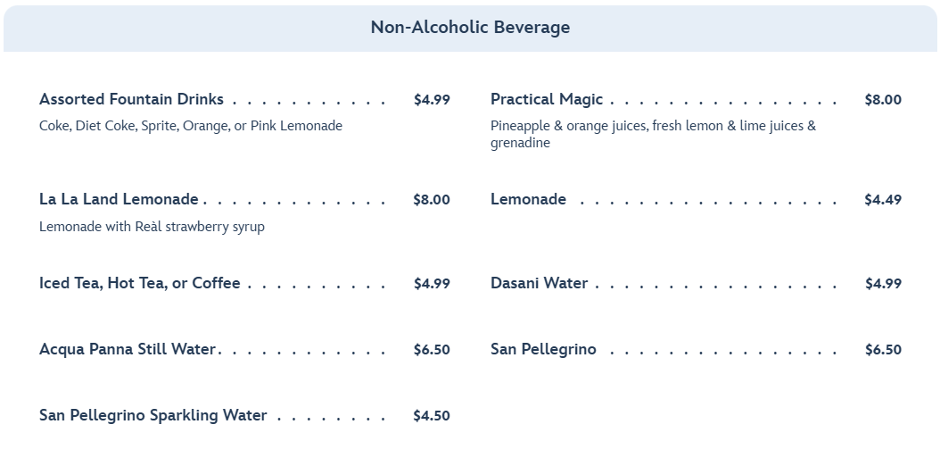 - You’re on a tight budget. Although the menu here is fairly casual, the prices are not. Burgers will run you $20 and more, which might seem low by Disney standards, but you can get the same kind of food throughout Disney for less. If it’s a burger you want, head on over to D-Luxe Burger instead to save some $$$.