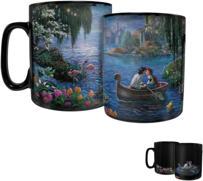 This one also features artwork by Thomas Kinkade. The original version shows Prince Eric and Ariel in the boat from the “Kiss the Girl” scene, but when hot liquid is poured into it, a gorgeous background scene is revealed.