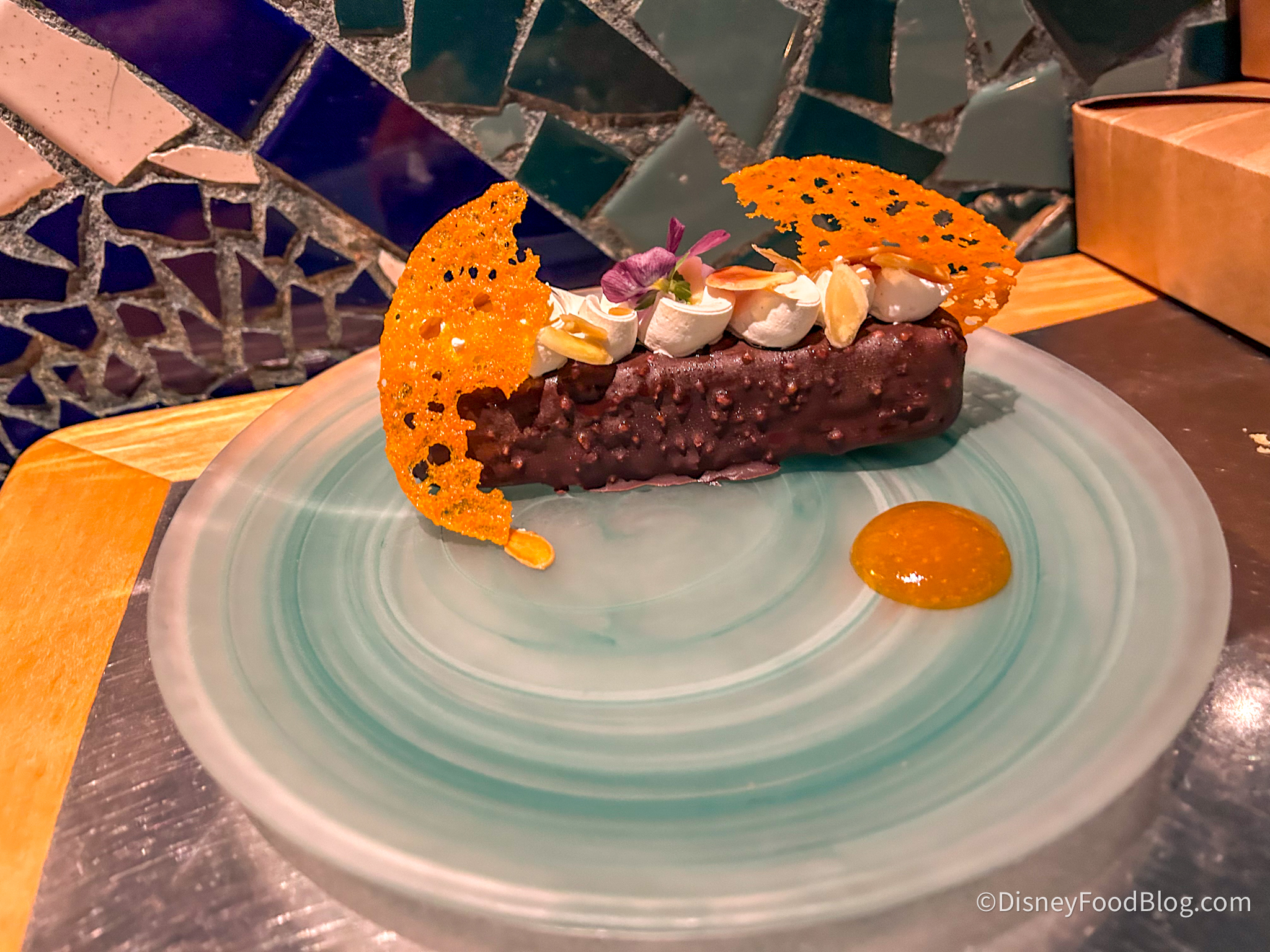 Finally, we snagged the Chocolate Mousse Bar for dessert. This is $11 and made with Chocolate Ganache, Almonds, and Orange Coral.