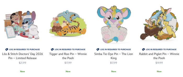 We can’t get enough of these new pins. The tie-dye collection is on point with plenty of Pooh Bear characters for spring. There’s also a Lilo & Stitch Doctors’ Day 2026 pin, which is a limited release.