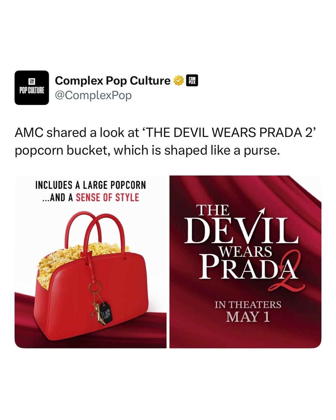 It’s now been reported on Complex Pop’s socials that AMC Theatres will have a NEW popcorn bucket for the release of The Devil Wears Prada 2, and it’s ICONIC, to say the least.