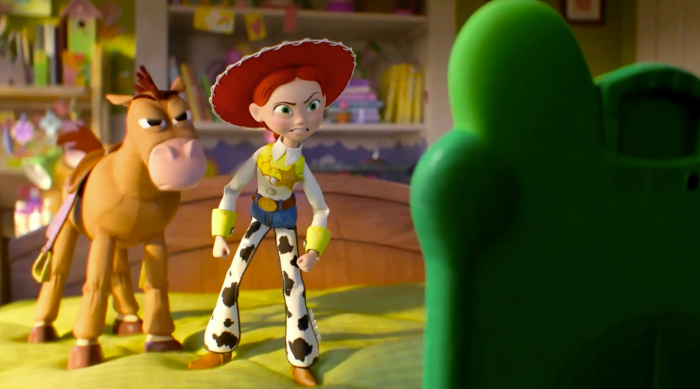 Woody is not seen in this sneak peek — instead, it’s Jessie who’s in charge in Bonnie’s room! She hops up to ask Lilypad some questions, and that’s where the toys really see all that she can do. She’s always listening, records their voices, and can play it back in new languages or change them into something entirely new, like a rap.