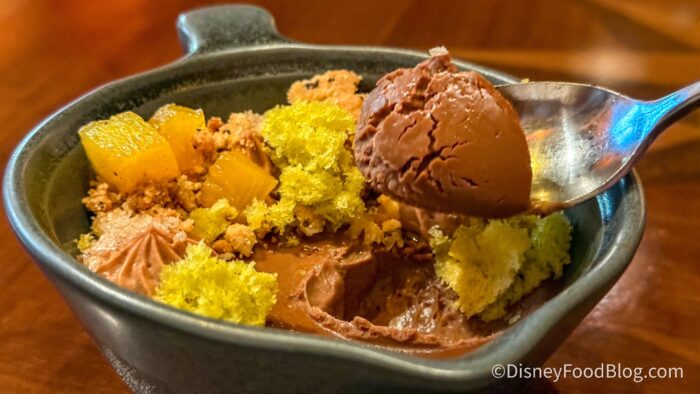 There were so many different elements on this plate that you’ll want to try to get them all in the same bite. The chocolate base was a bit thicker than pudding and was almost difficult to dig our spoon through it (but it was worth the effort!). There was a light cake on top that was almost like eating air, and the cookie had a tiramisu flavor with a crunch. The crumbles along the sides added some saltiness, too, which was a nice, different taste.