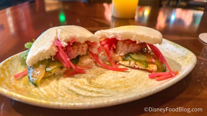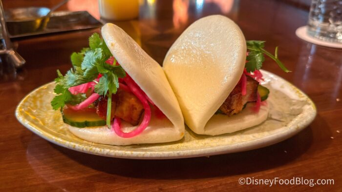 First, we tried the Korean Barbecue Pork Belly Bao Buns for $16, and they come with pickled cucumber, green papaya slaw, and cilantro.